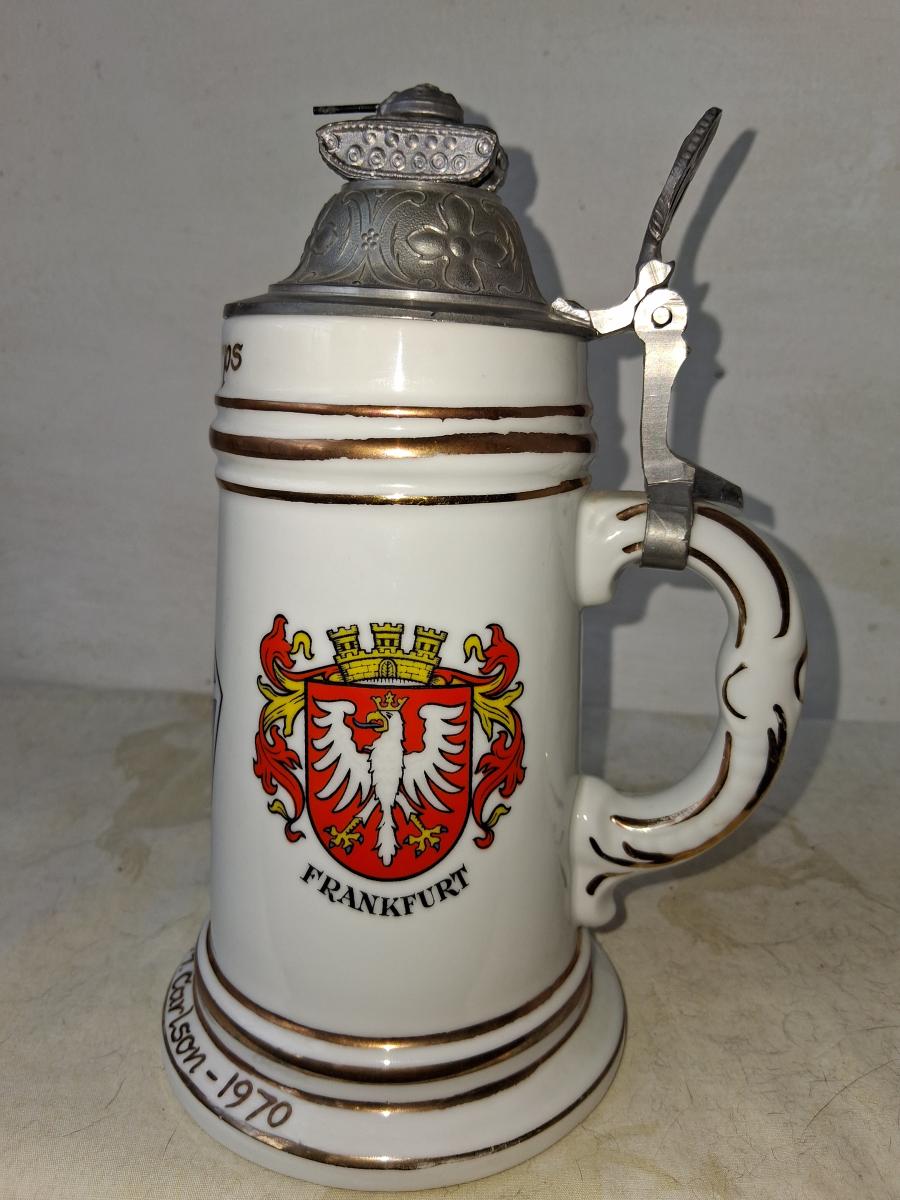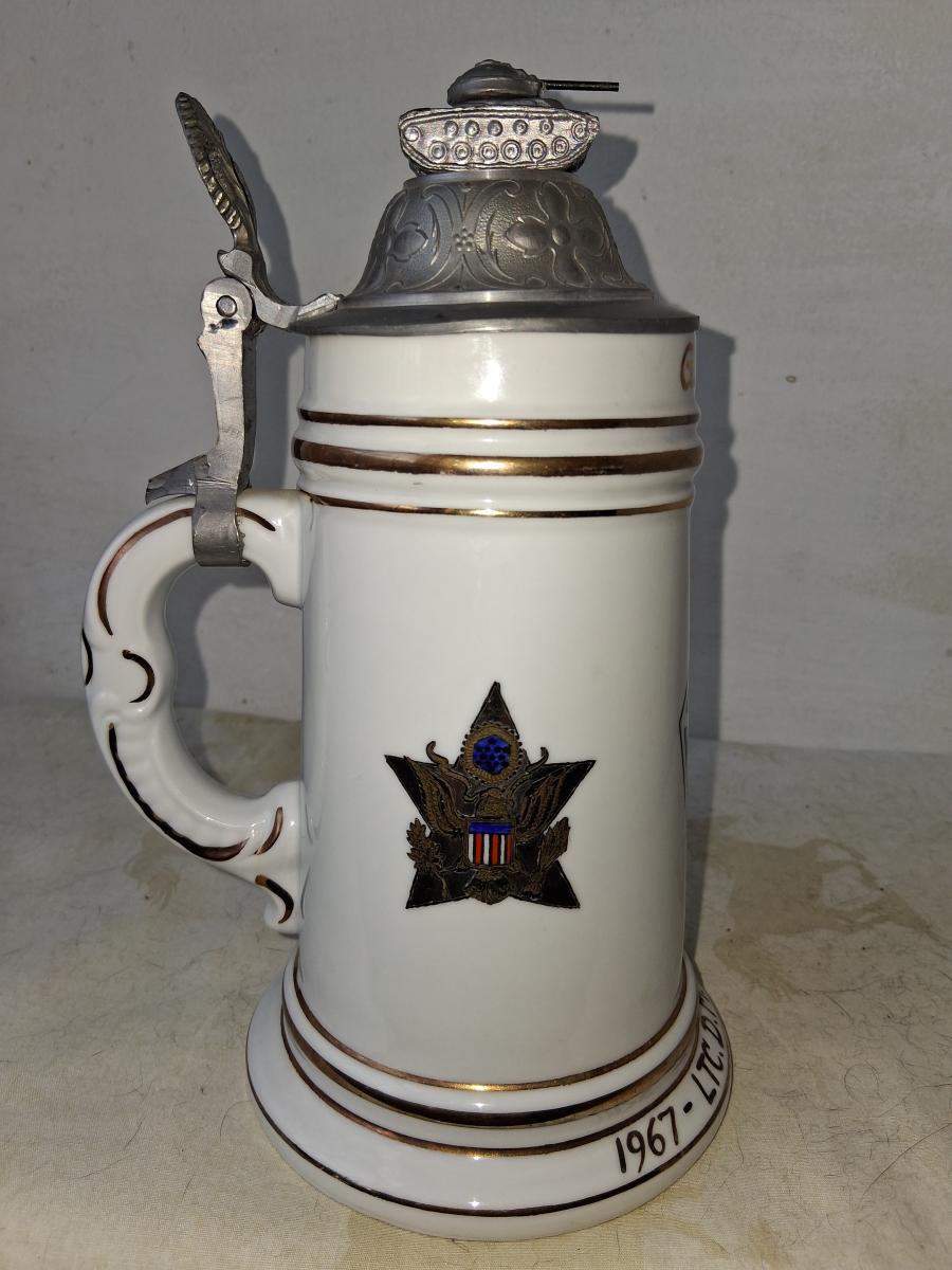 At the top fromt of the stein is "G2, VCorps". Pictured in the middle front is the insignia of the V Corps. At the bottom fron is " 1967 - LTC. D. M. Carlson - 1970". On the left side of the stein is the U.,S. Seal over Star that was a pin worn by General Staff officers. On the right side is the coat of arms of Frankfurt. V Corps was established in 1918 and has served an important role with NATO.