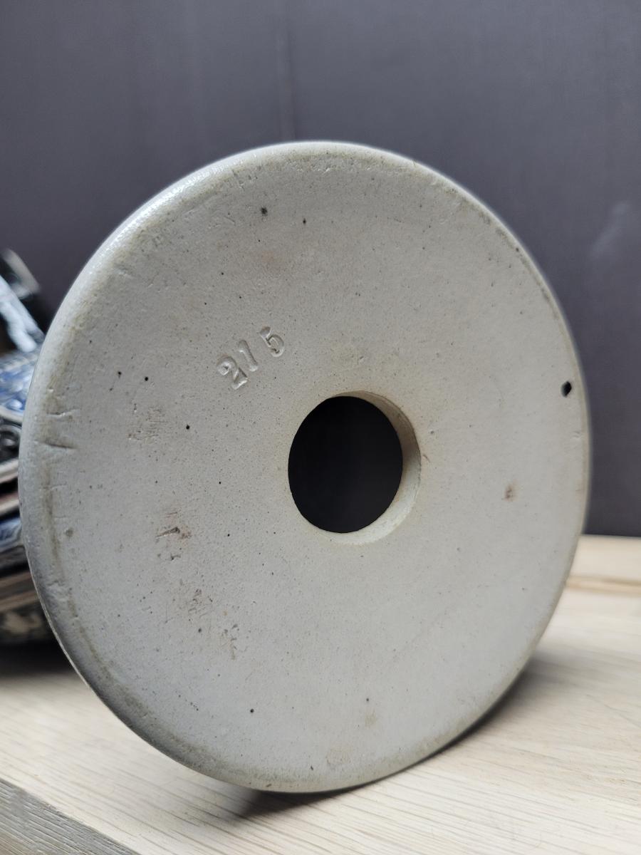 A stoneware jug, saltglazed. Blue/gray coloring with black details.
