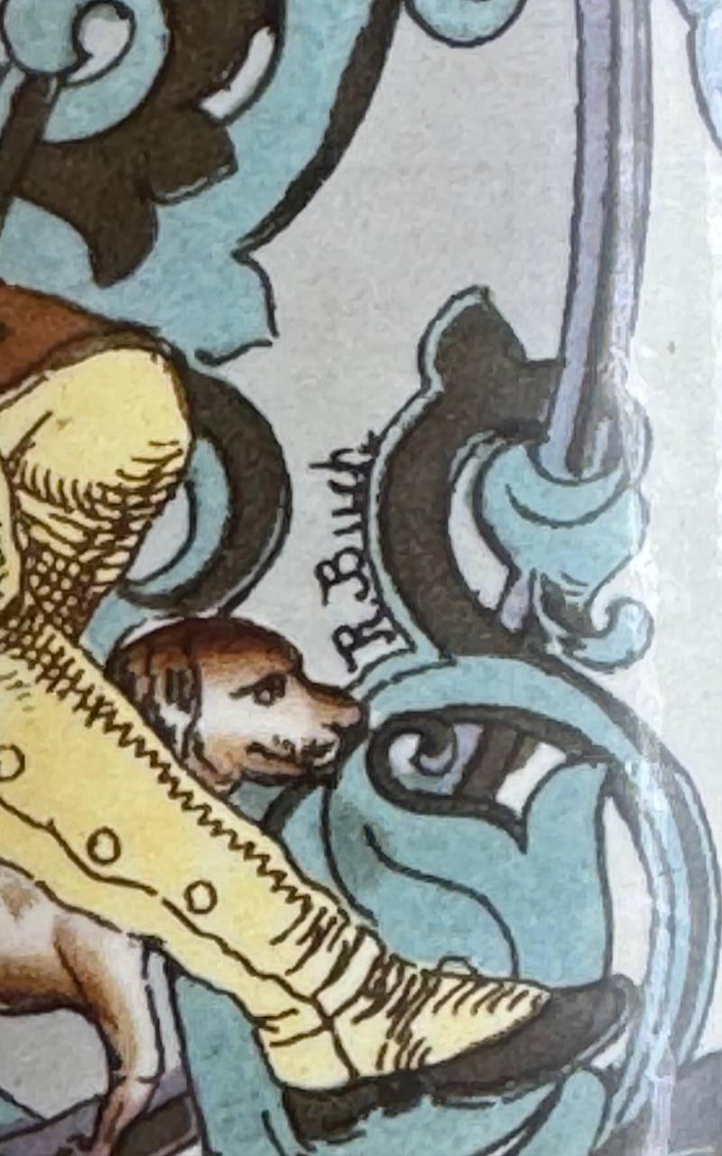 The Smoking Hunter mug. This antique mug was made in 1888 by the famous Villery & Boch factory. It has a capacity 0,5 liters. In the Villeroy & Boch catalog, the mold of this mug is registered under the number 1530. The mugs of this mold were decorated with various subjects. In our case, the decor of the drawing in the Villeroy & Boch catalog has the number 580. The mug is decorated with an inlaid lid. The ceramic inlay features a stylized image of an Edelweiss flower, which is one of the symbols of Alpine hunters. The lid with such an ornament significantly increases the collector's value of this mug. Additionally, the mug's value is enhanced by the presence of an autograph by the artist-author of the drawing R. Buch. It is placed near the head of a hunting dog.