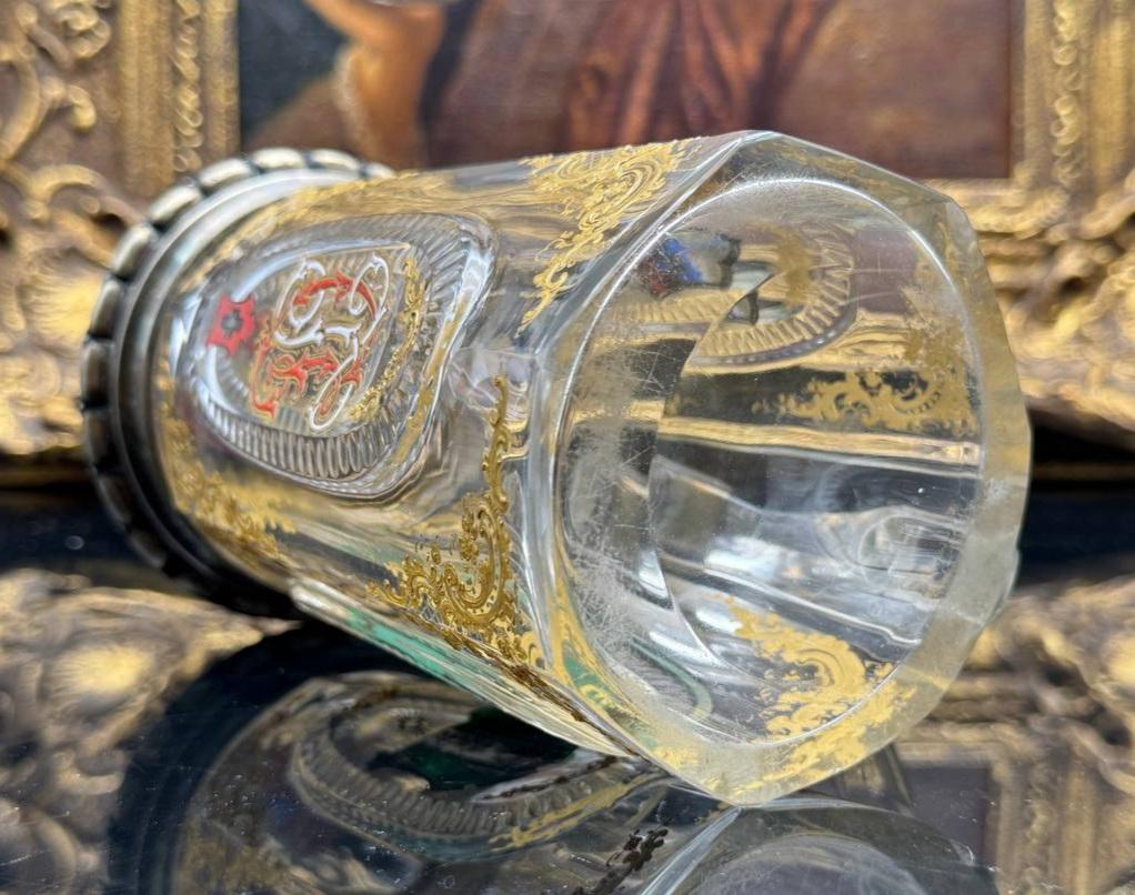 The mug was made in 1890. The base of the mug is made of Bohemian crystal by pressing into a mold. This is noticeable by the characteristic vertical scar on the outside of the handle. At the end of the 19th century, this technology was considered quite rare in Europe due to the fact that, unlike the technique of glass blowing into a mold, pressing was only possible with special equipment from the USA. Pressing also made it possible to obtain more advanced shape parameters for crystal products. Simply put, it was a higher-quality and high-tech method of working with crystal. Bohemian crystal differs from glass by its high density, the play of the light spectrum and durability. It is the most preferred material for premium class products or luxury items (from the English luxury — luxury).