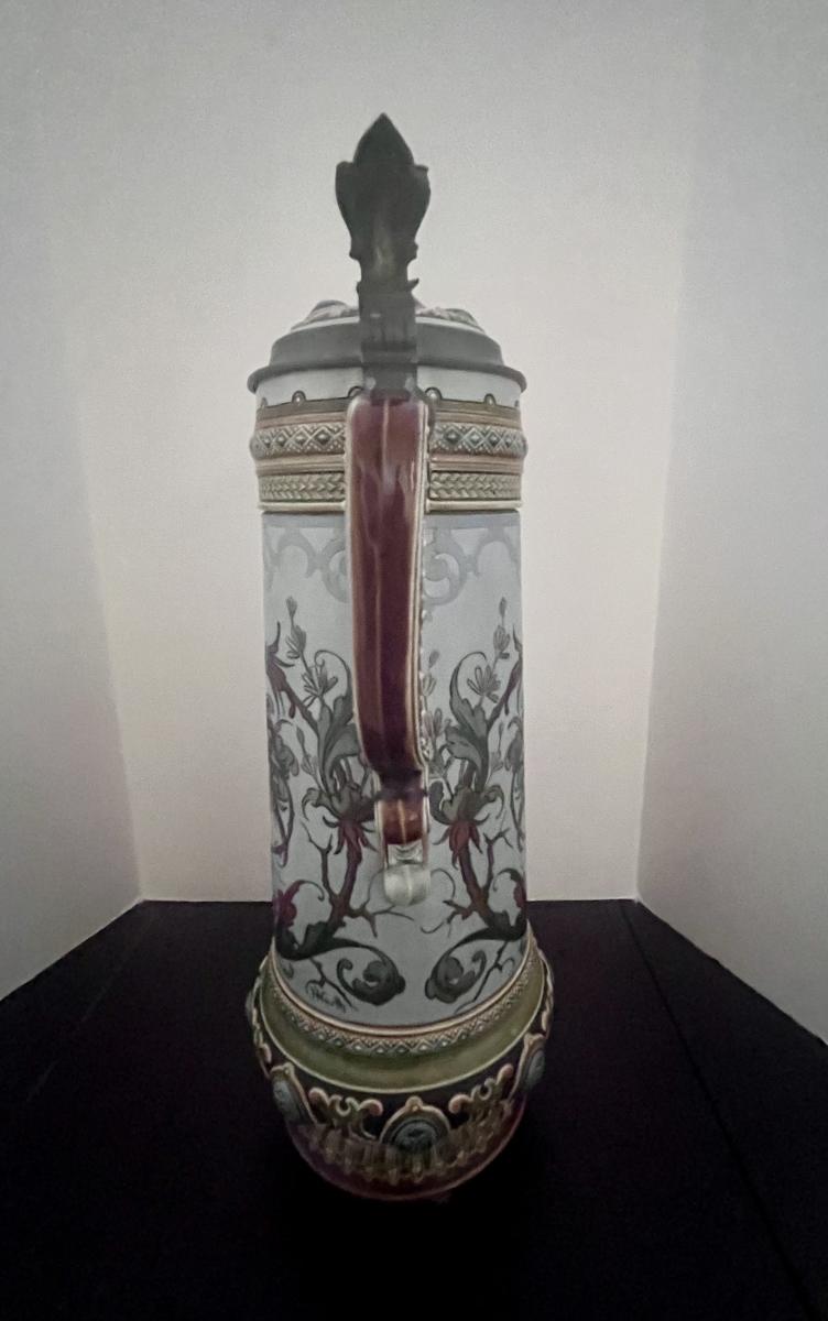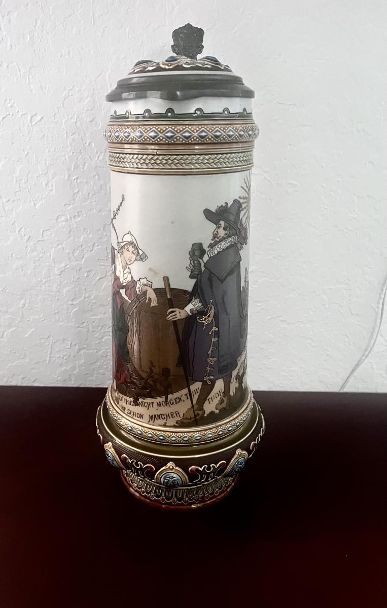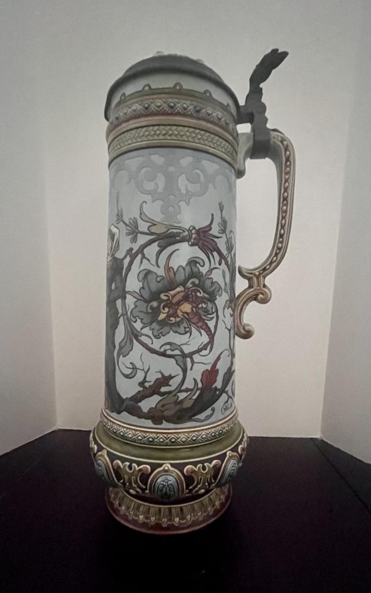 An etched 2.1 liter “jeweled stein by Mettlach signed by H Schmitt..