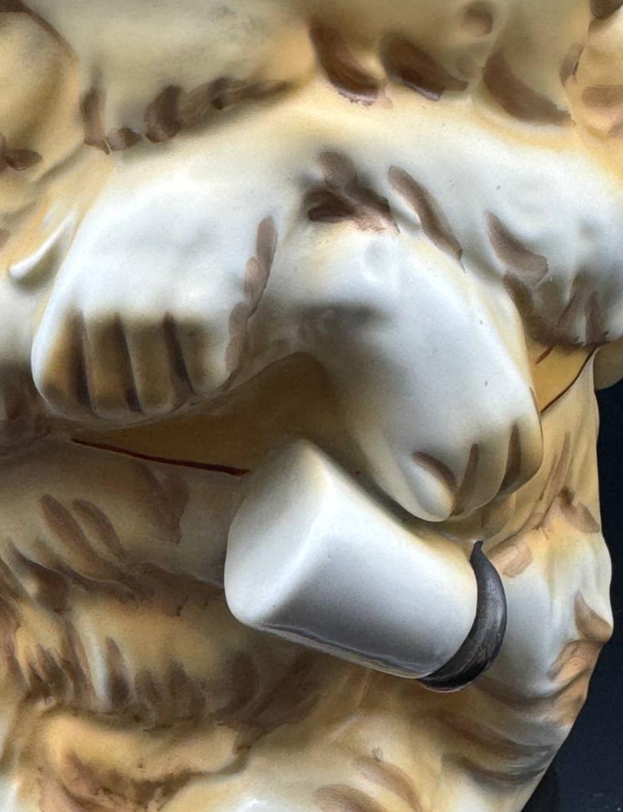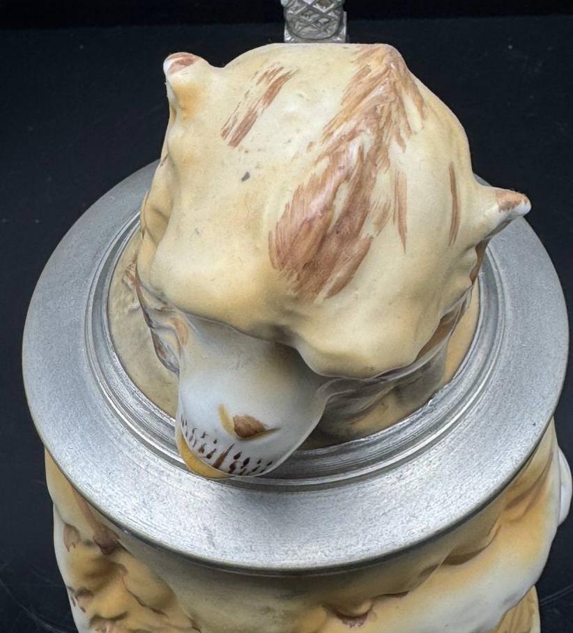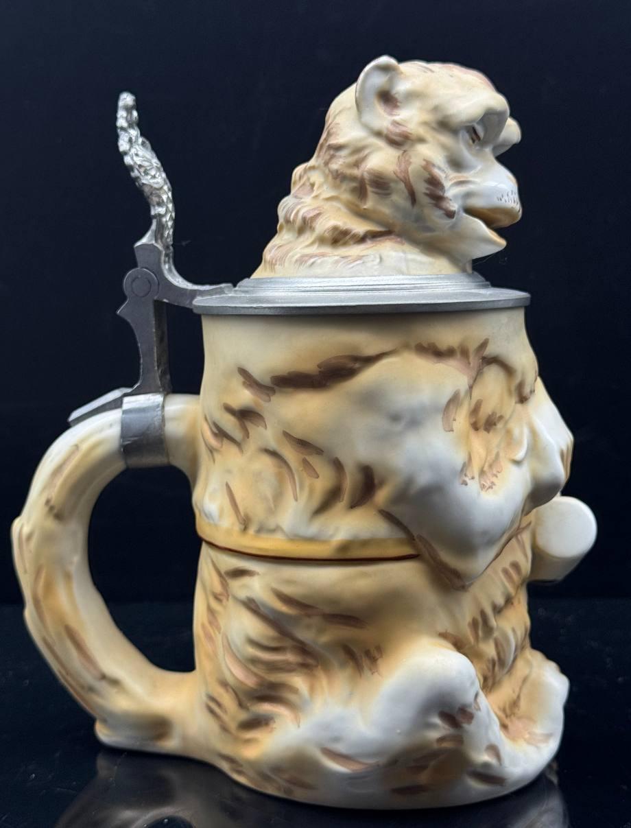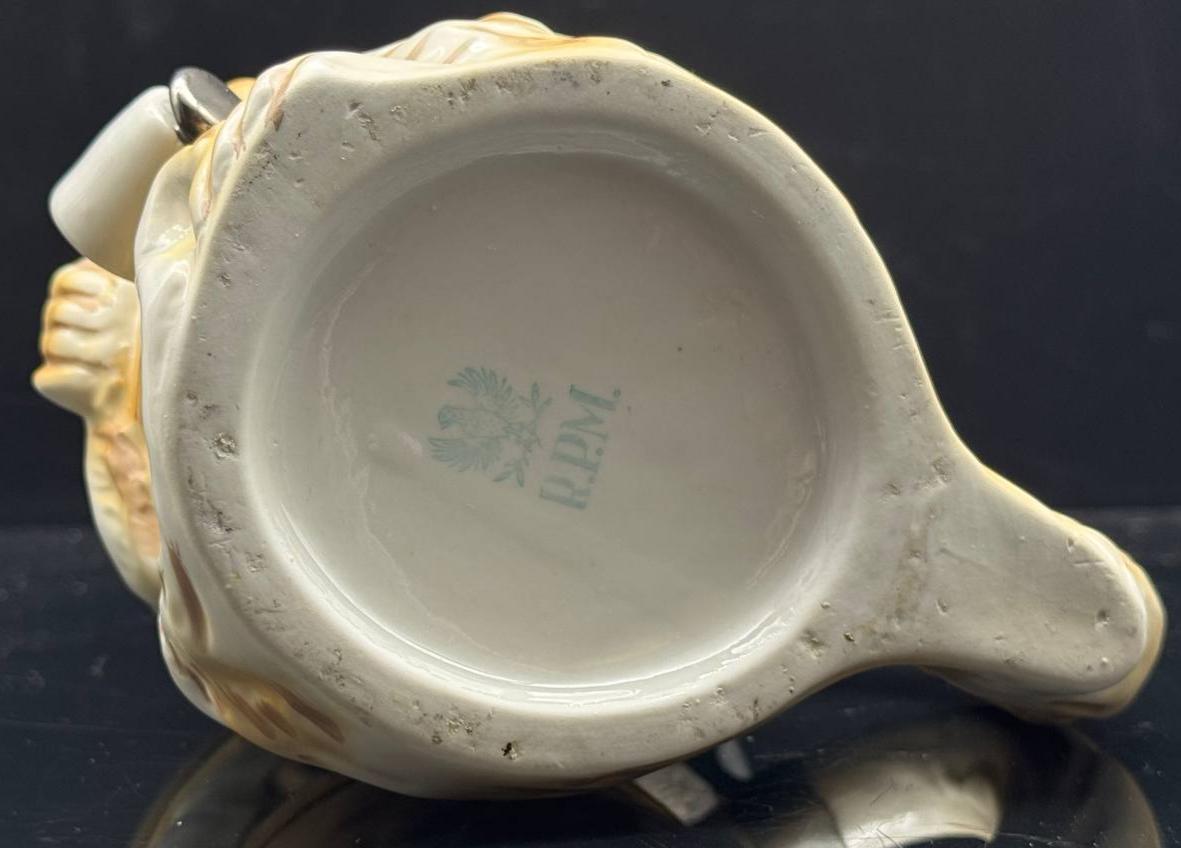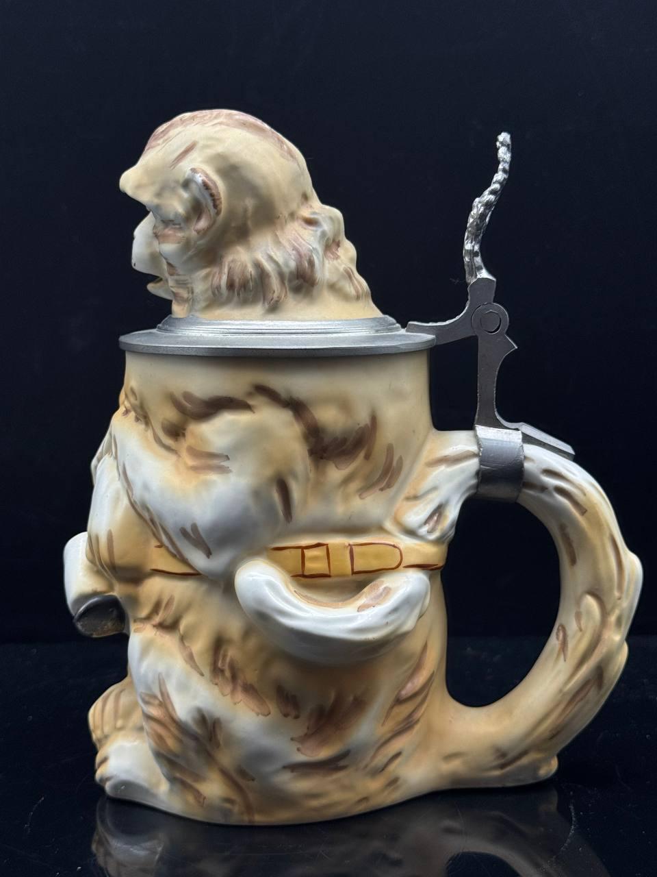Collectible shaped beer mug made of porcelain "Drunken Monkey". The mug has a capacity of 0.5 liters and a height of 21 cm. On the outer surface of the bottom of the mug, there is a green stamp with an eagle above the letters R.P.M. This mark was used between 1955 and 1973 by the German company Royal Porzellan Manufaktur G.m.b.H. (R.P.M.).