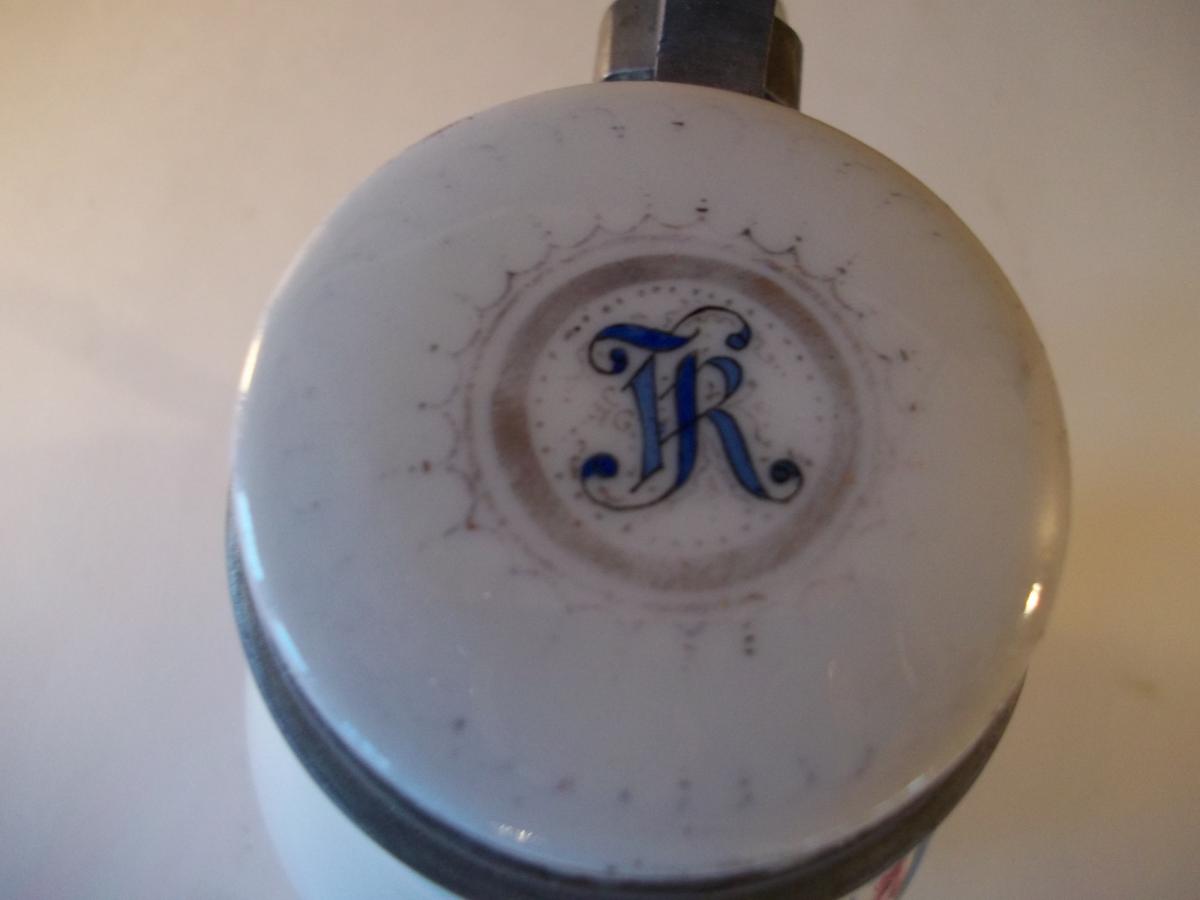 Bit of an unusual shape and lid. The decoration is hand painted. "Josef Karner 1889 With Heart and Hand for Alpine Land. Topped with a Chamois, often used as an Alpine symbol. Lid has initials JK and inside a date, February 5, 1878, which differs from the date on the front. No markings.