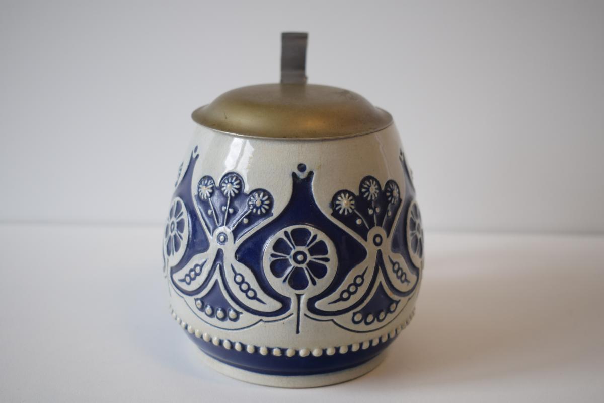 Light/tan body color. Decorated in blue, geometric and floral design. art deco style.