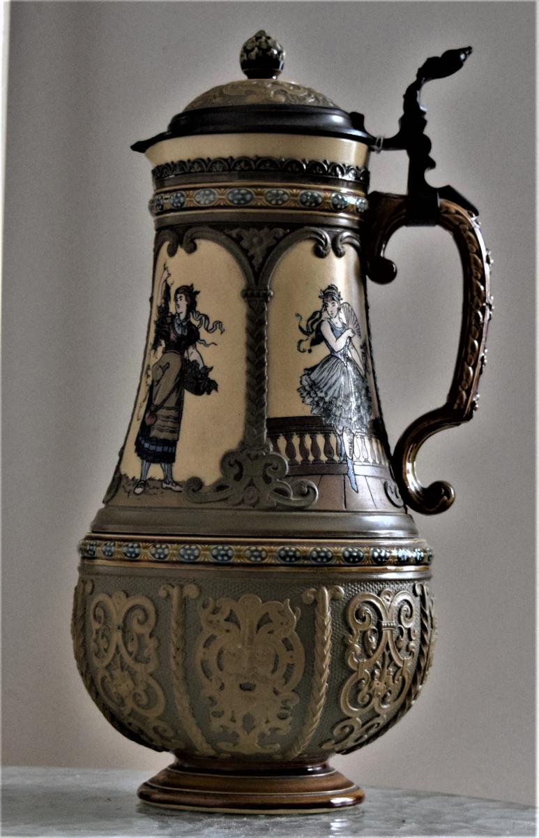 2/3 L Ewer 2d Hand painted etched Figures by Mettlach Inlaid lid