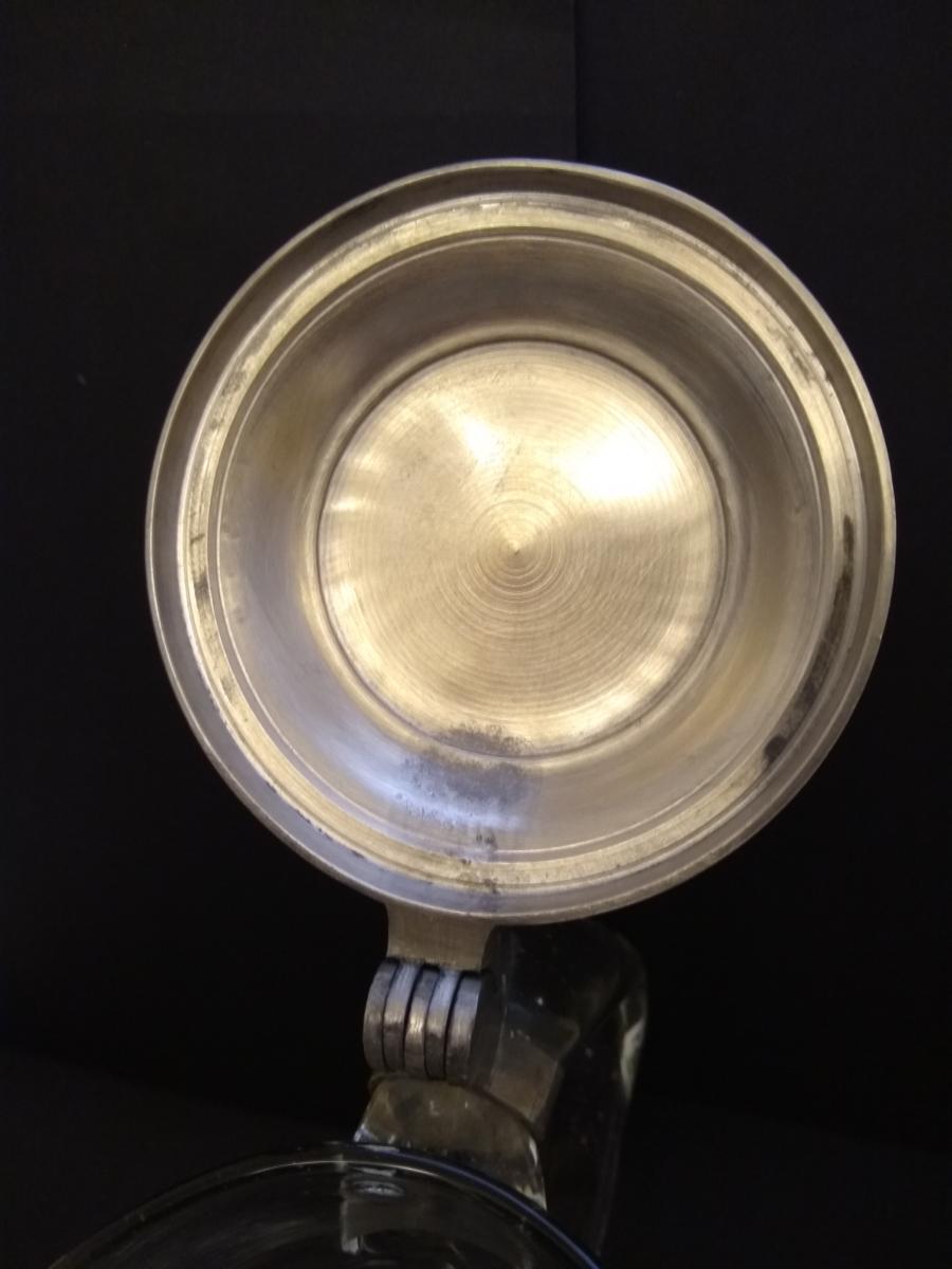 A glass beer stein with the initials 'AMRA' and '1849' engraved on the lid; the wheel engraved body is embellished and engraved with 'Dankbarkeit'