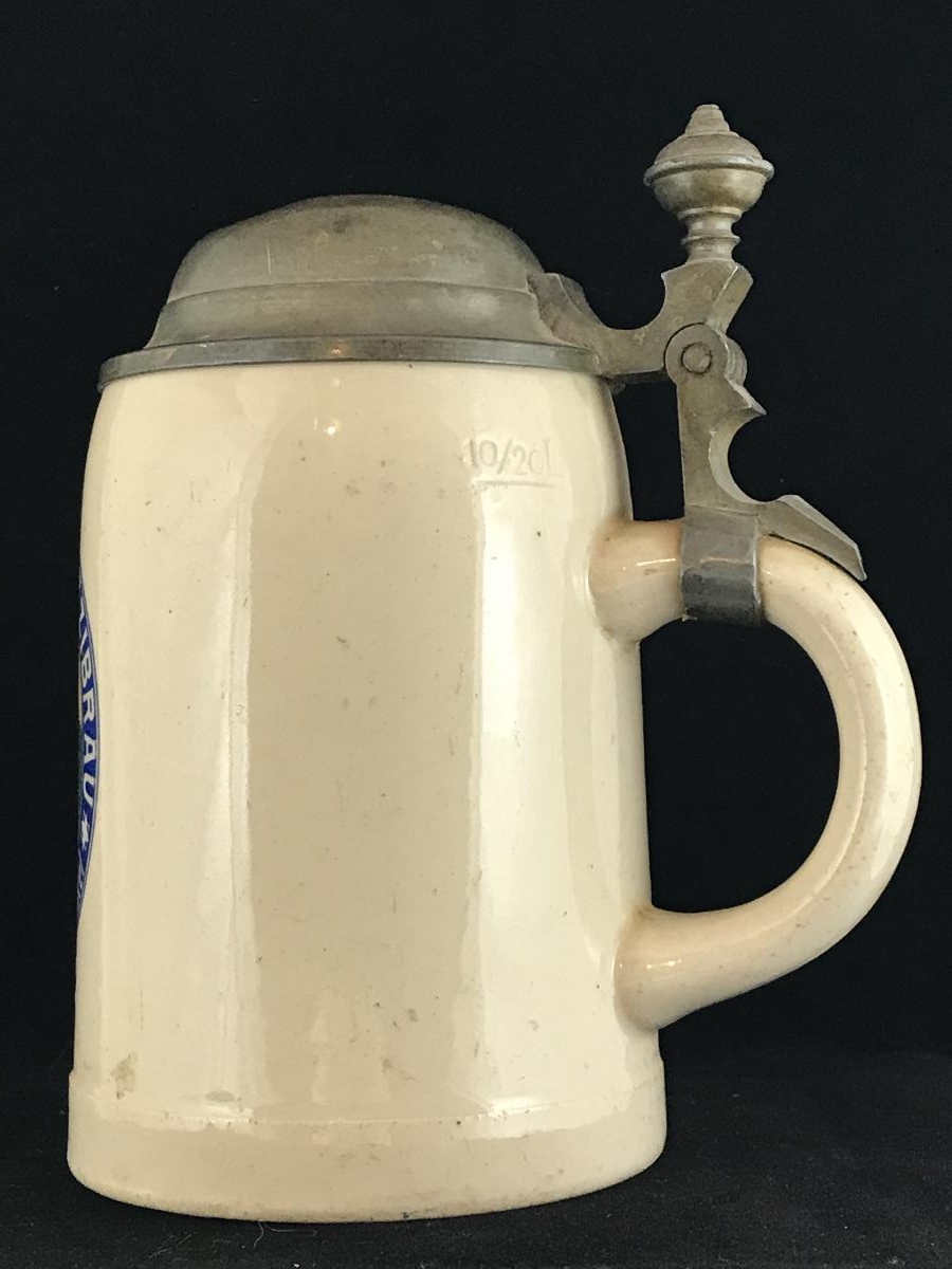 This ½ liter brewery stein with a five pin, open hinge, was manufactured by Marzi & Remy as indicated by that company’s mark on the bottom.