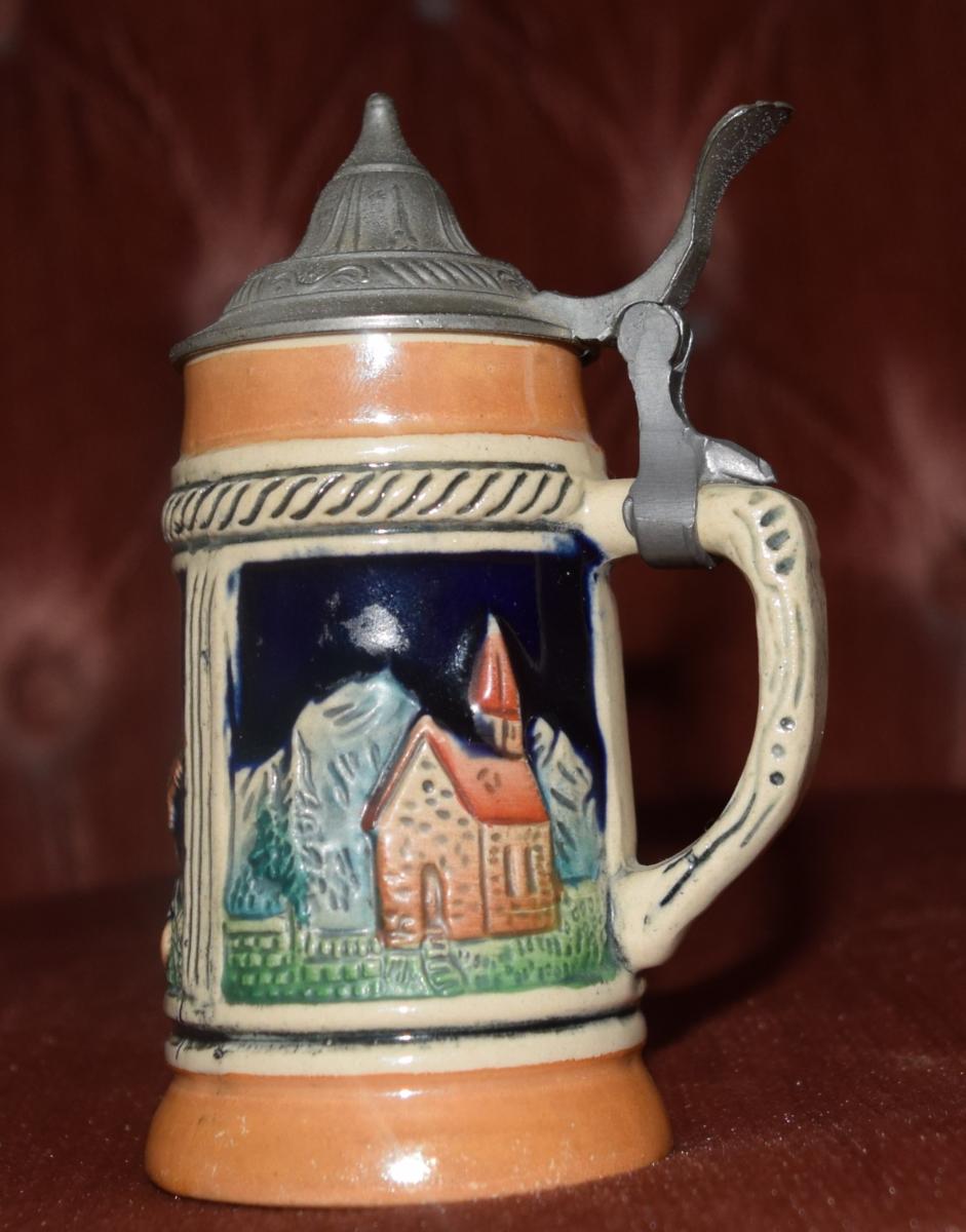1/8L full Color with Guitar Player in Relief. No makers or capacity marks DGBM and 43 inside pewter Lid
