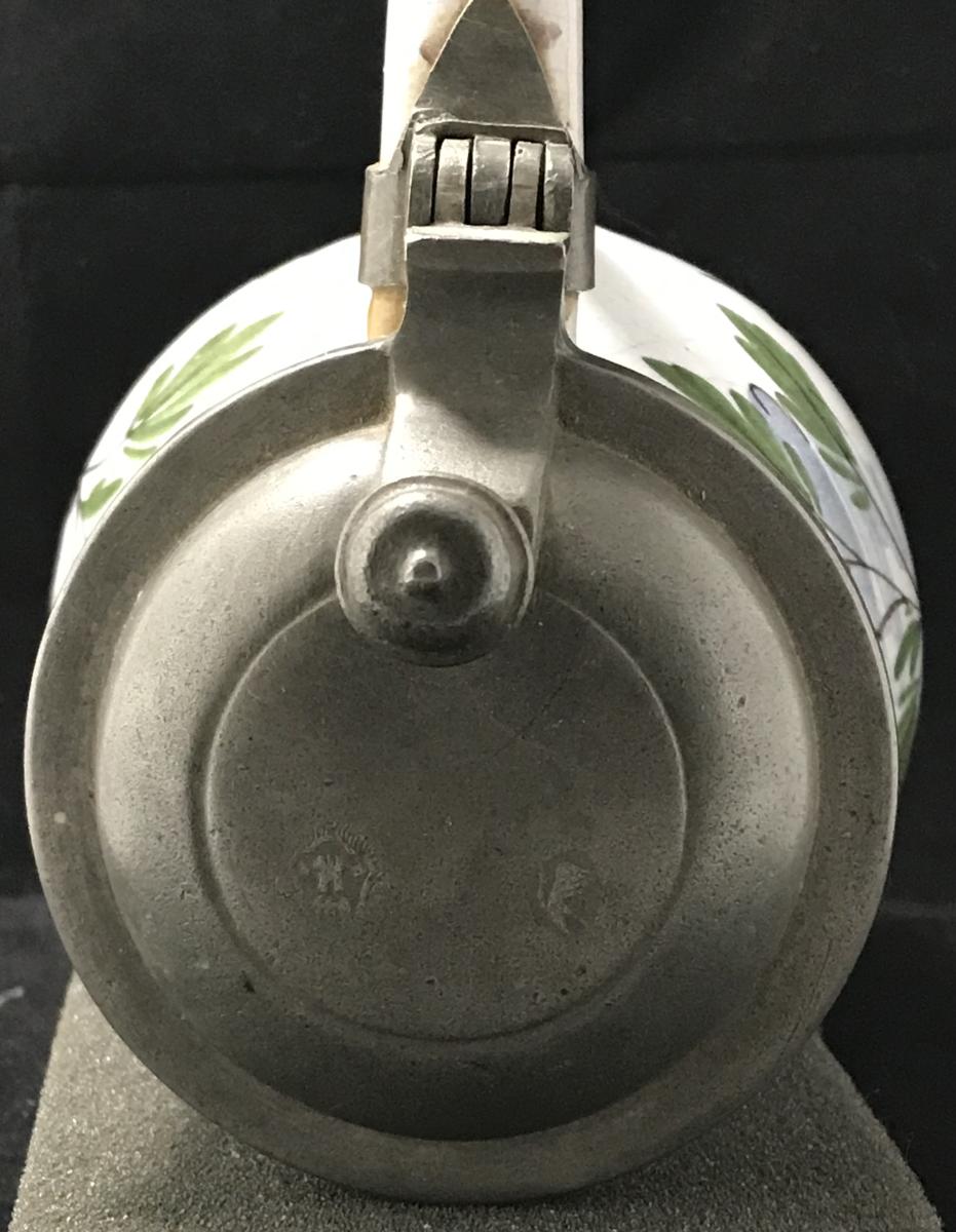 The wide hinge is indicative of a reproduction/fake. Some additional indicators that these are fake/reproduction faience steins are: