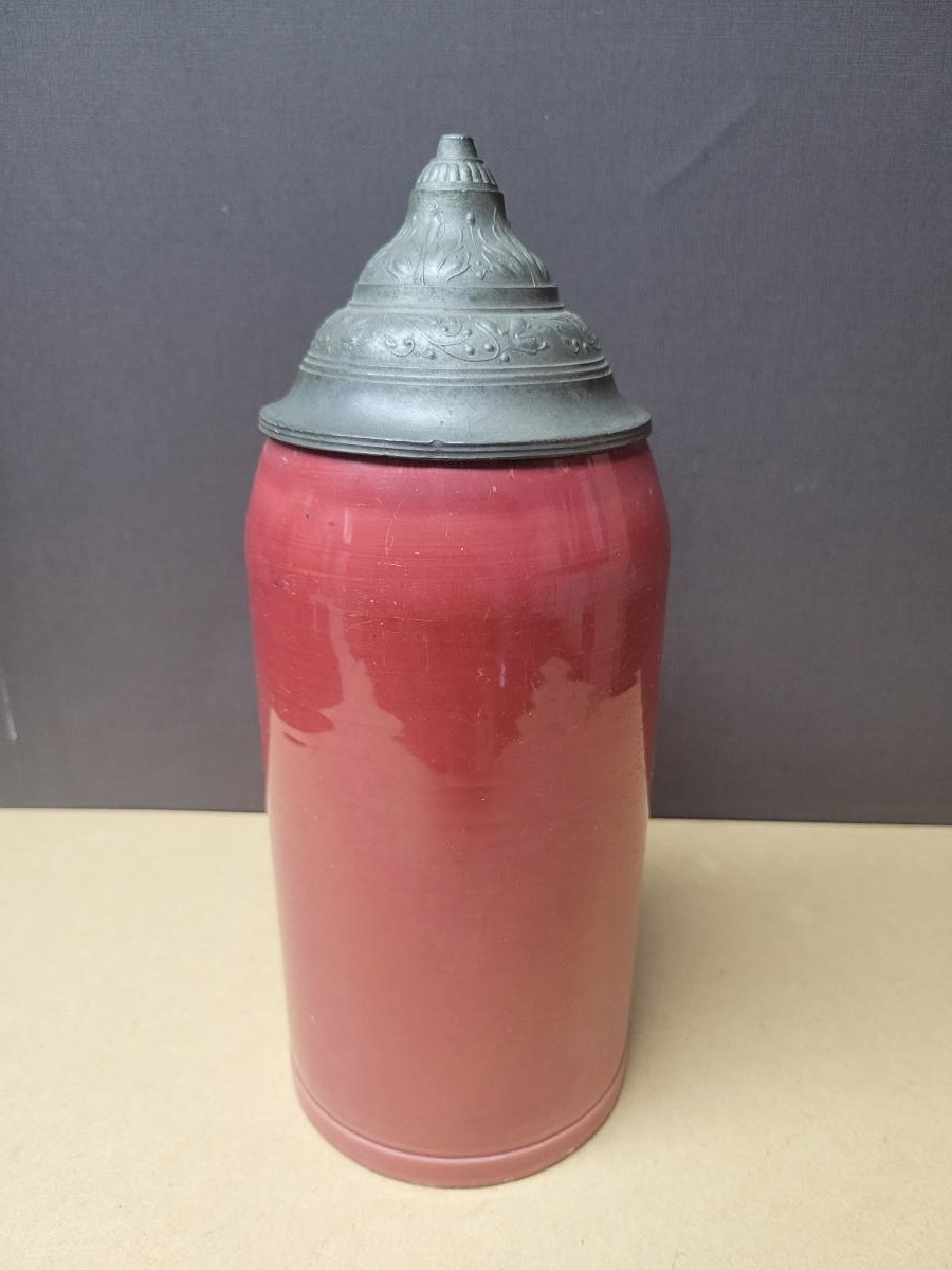 Fayence, with pewter lid. No maker's marks. Capacity circa 1 liter.