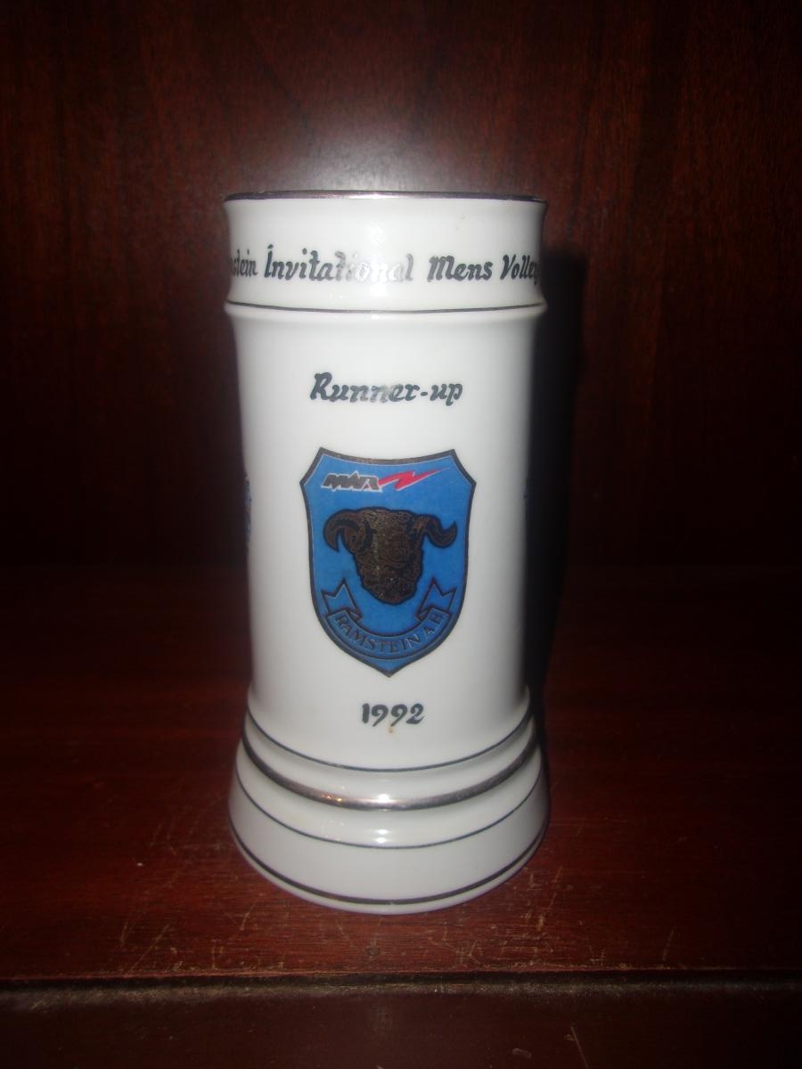 While this mug (there's no sign that a lid was ever attached) is done in the style of Cold War steins, it can't be called one since German Reunification occured in 1990 and this is dated 1992. However, there were still plenty of U.S. military personnel in Germany and Ramstein Air Base was a major installation. This was an award stein for "Runner-up" in Ramstein Invitational Mens Volleyball.