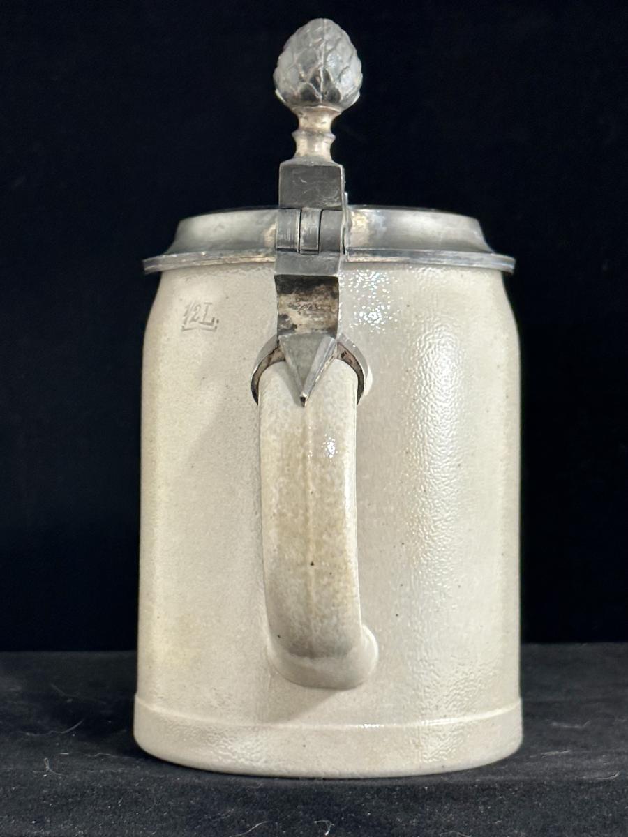 The pewter lid has a 3 pin hinge and a view of the Hofbräuhaus. Inside is a personal engraving „Prosit Hans! 23 V. 08“ (Cheers Hans! 23 May 1908)