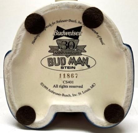 Ceramarte Ltd, Santa Catarina, Brazil started making steins 1956-today. The 4th and last addition Bud Man "Dauntless Defender of Quality" first appeared in 1969 advertisements. This CS401 "Collector Series 401" stein is about 9-3/4" tall, no capacity mark or mold number. It was issued in 1999, 30th Anniversary of Bud Man.