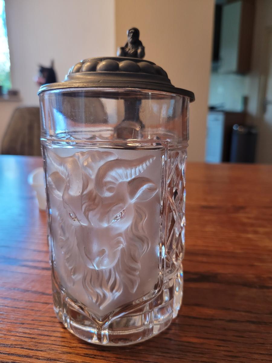 A heavy glass stein with a pewter lid. On the lid is the paragraph 11 sign inscribed. The thumblift is of a monk holding 2 large beer jugs.