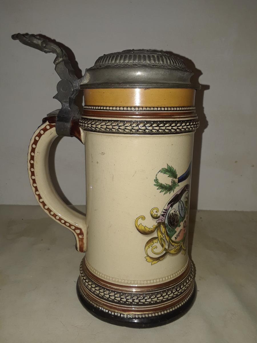 Molds 922 and 990 were the most used bodies of all Marzi and Remy's numerous various subjects steins. This one is celebrating a cycling club (or union as it says here) with the standard "All Heil" used on such steins. Recessed base.