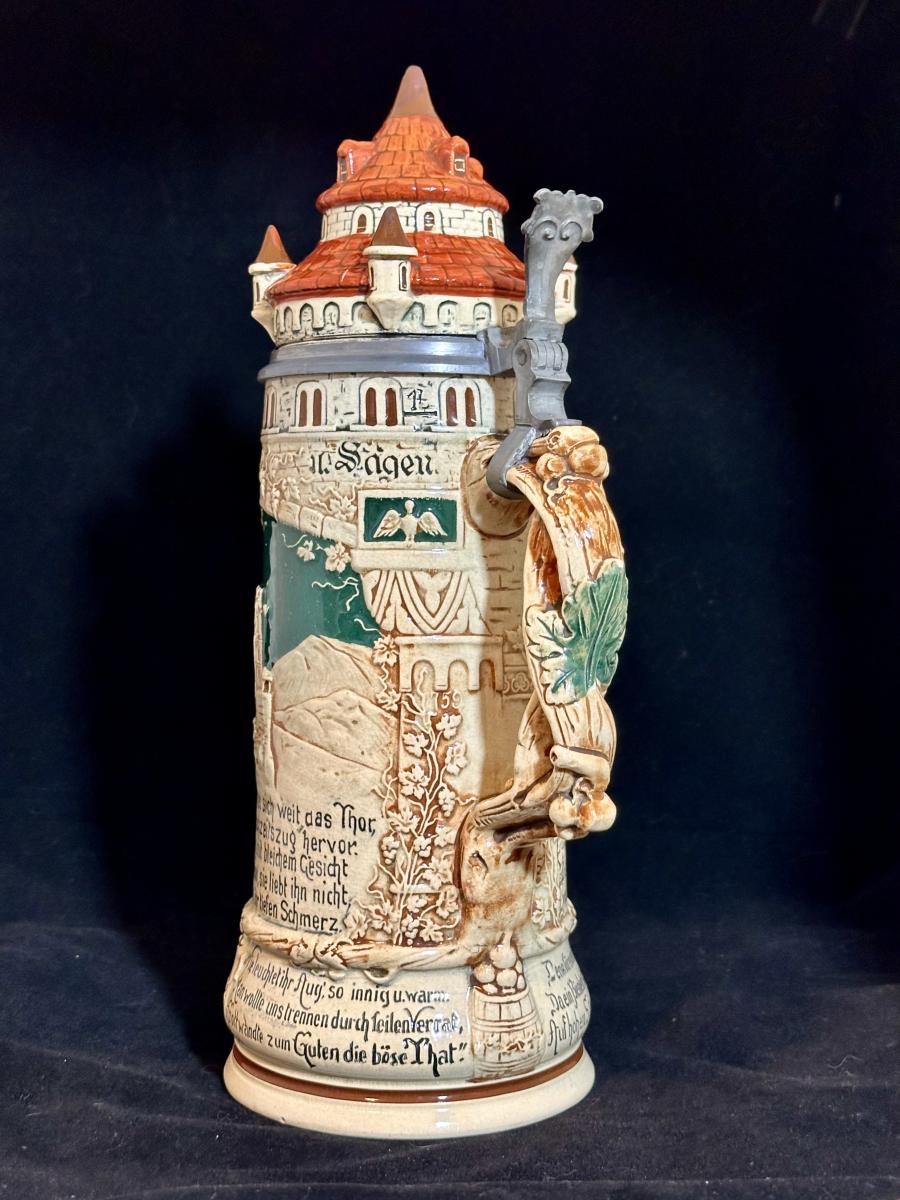 A 1 Liter Girmscheid pottery stein with figural lid in the design of a castle tower roof, mold 759 “The Bride of Rheinstein”.