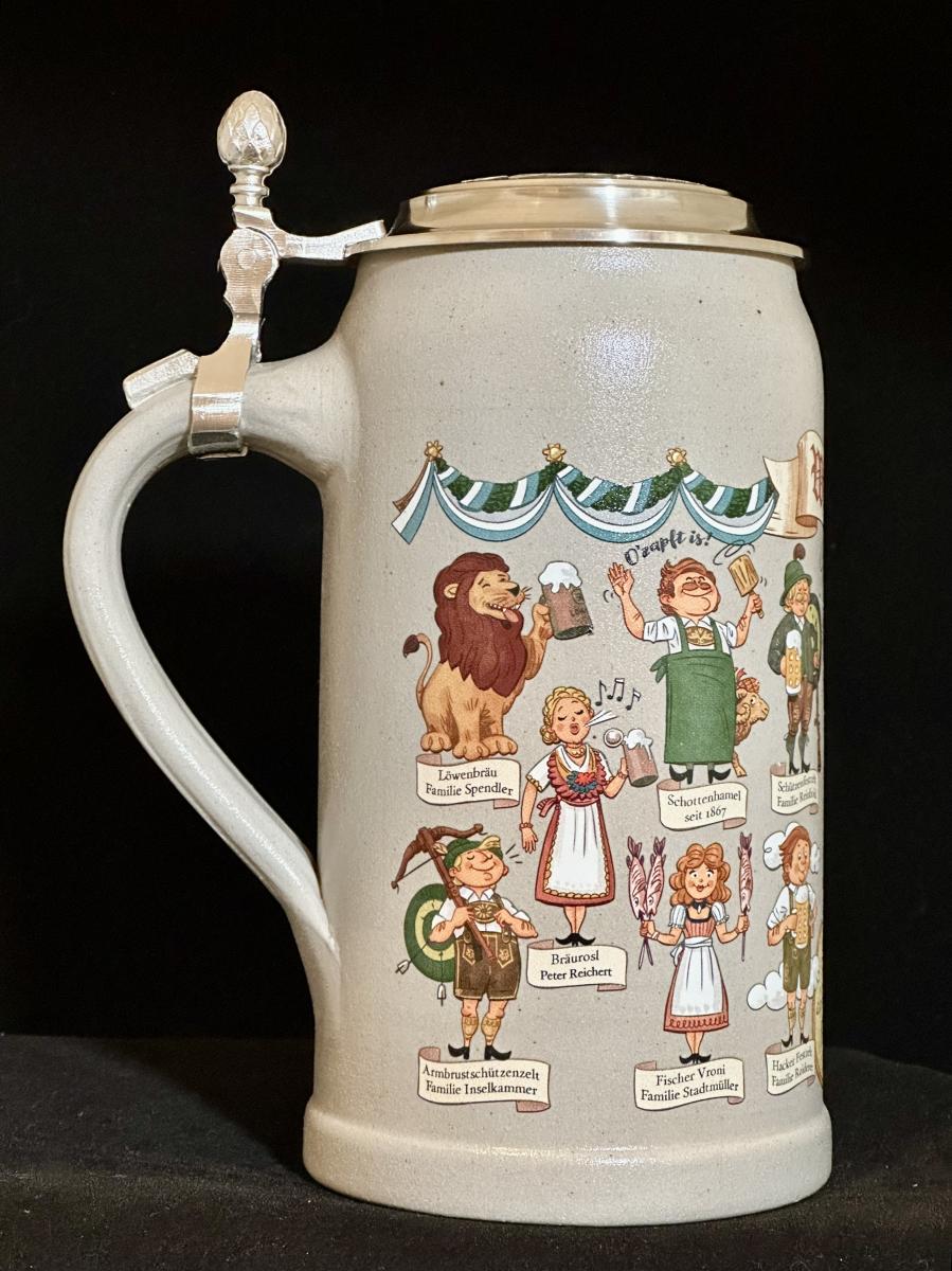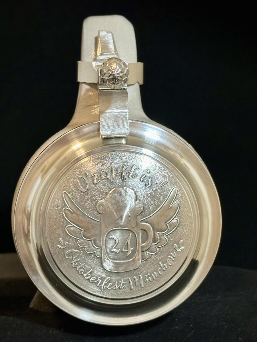 2024 Wisenwirte 1 liter stoneware stein with pewter lid with a relief of a beer later. With wings with 24 on it. The stein was designed by Rudi Skukalek, a Munich graphic artist. Each of the beer tents and beer tent hosts are represented with a comic figure.