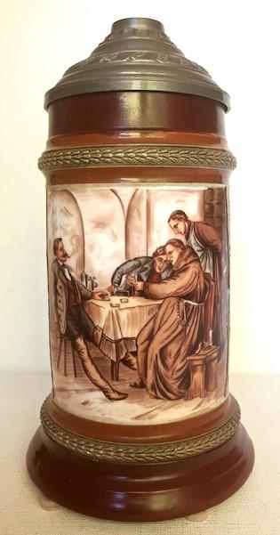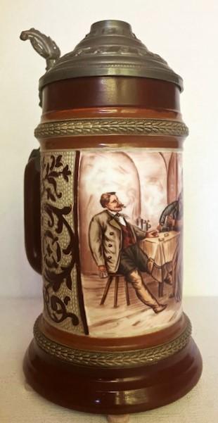 Made in the Freising factory by Hauber & Reuther 1886-1905 porcelain production period. H&R lost its clay supply for stoneware in 1886 and started producing porcelain, they could use the local clay in that area. Their porcelain steins were thicker and heavier and never had lithophanes. At first, they had a lot of problems with breakage. When porcelain is fired it shrinks as much as 20-30% but because the clay throughout is the same density when it comes out of the mold, this is usually not a problem. However, if you stamp anything into the clay, the clay is compressed by the stamp and is a different density than that surrounding it and when fired will shrink at a different rate often causing the piece to pull apart. For that reason, the stamped marks had to be replaced by marks that are less intrusive. The HR logo was lightly scratched in and painted over. A lot have two HRs on the base, the second is a decorator HR mark, it was only painted on as was the Germany. Early capacity marks were stamped in and soon all were painted on. Mold numbers can be stamped, painted on or just scratched in. The "Geseztlich geschutst" mark is only stamped in or missing. All the ones I have seen on stoneware steins start with a lower case g and all the porcelain ones start with a capital "Geseztlich geschutst". This has a painted on mold 188 followed by /20 for the front painting used. The 1/2L capacity mark is behind the pewter strap and is very hard to see. The stein is about 6-1/2" tall and 8-1/2" to the top of the pewter thumblift.
