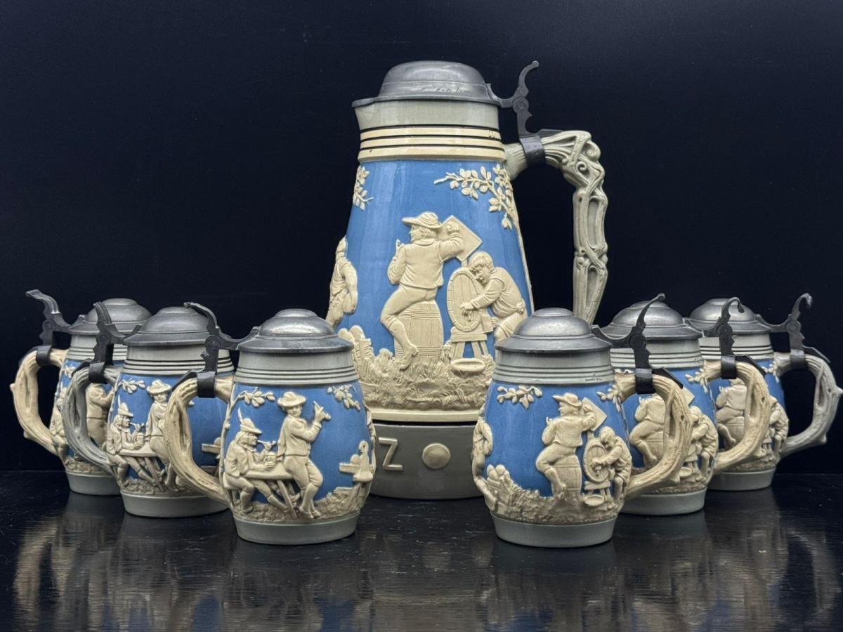 Manufacturers used large beer jugs as part of a set of six smaller mugs. These mugs had different shapes and were listed under different numbers in the manufacturers' catalogs.
