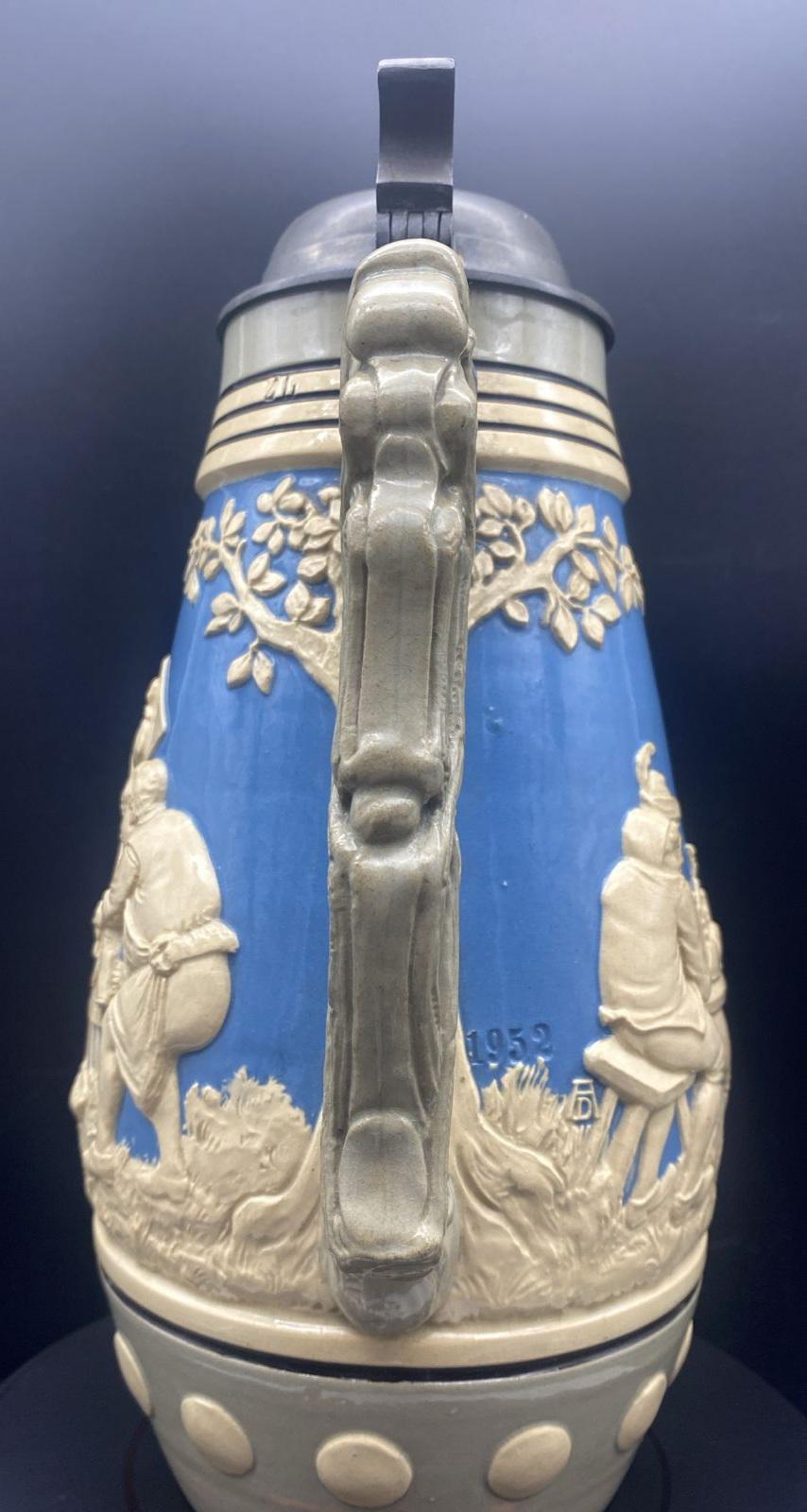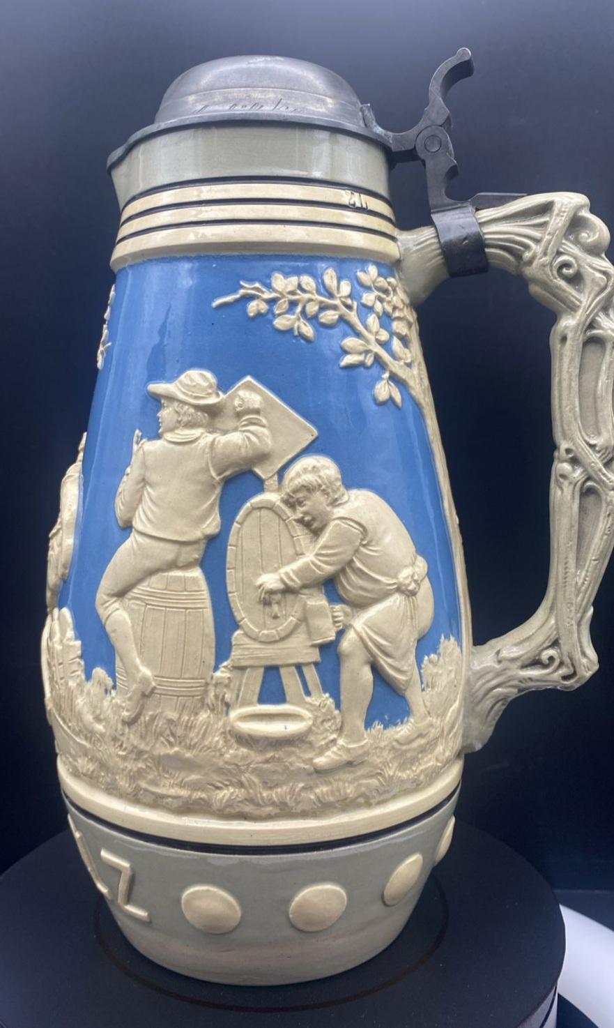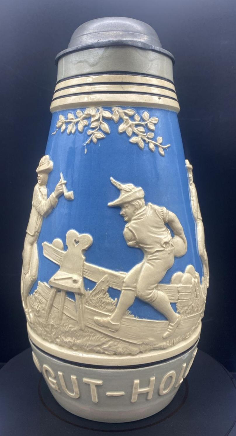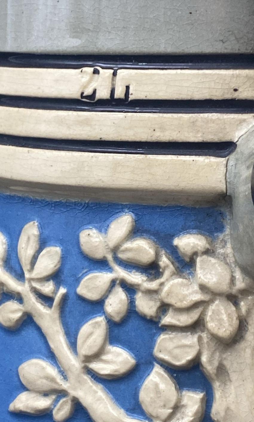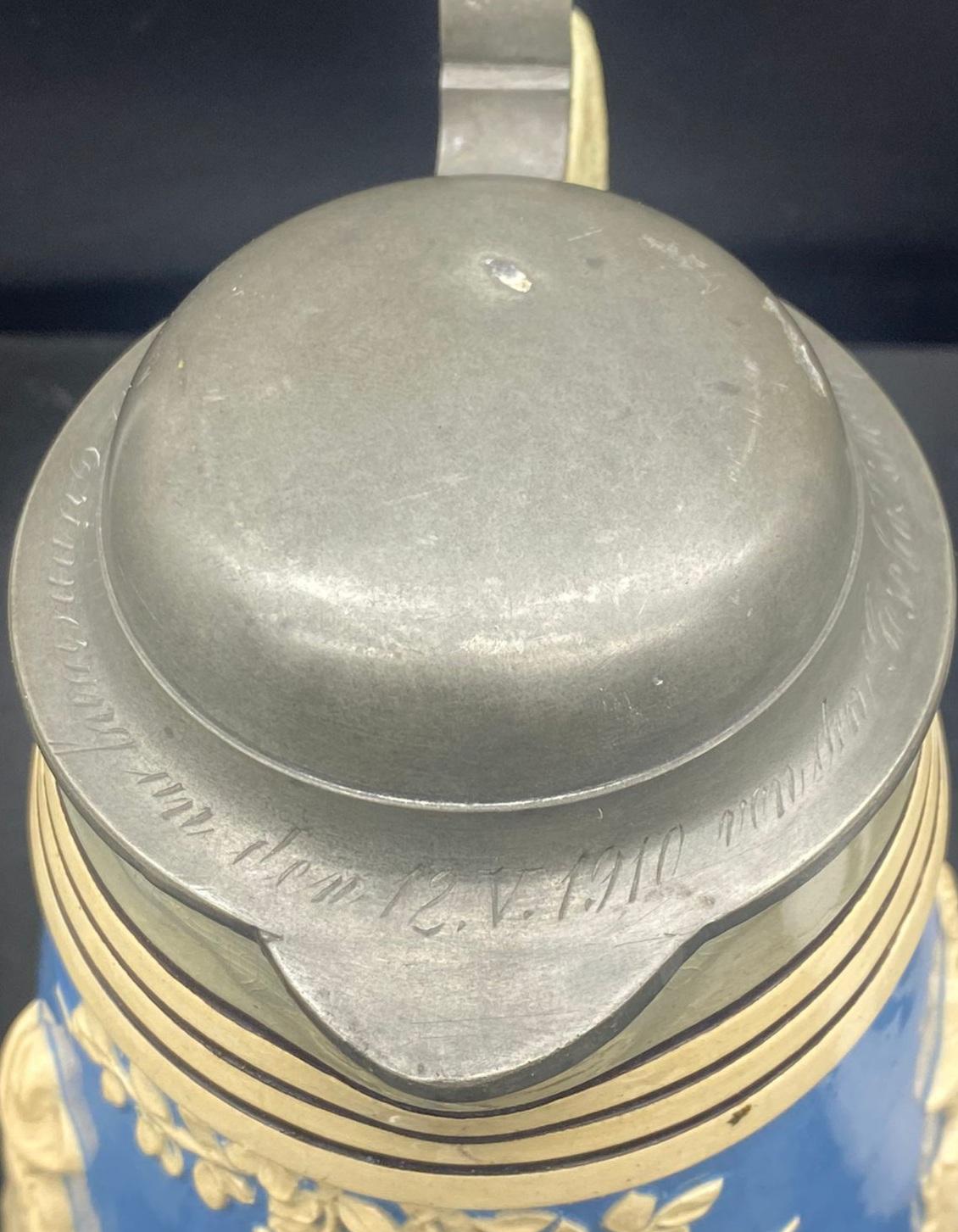 This blue and white 2-liter jug was manufactured by Reinhold Hanke (RH) around 1909-1910. The date present in the engraving on the lid of the jug allows us to draw a conclusion about the year of manufacture.