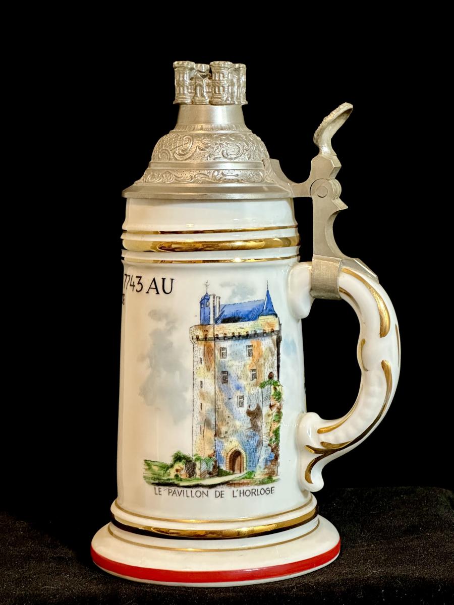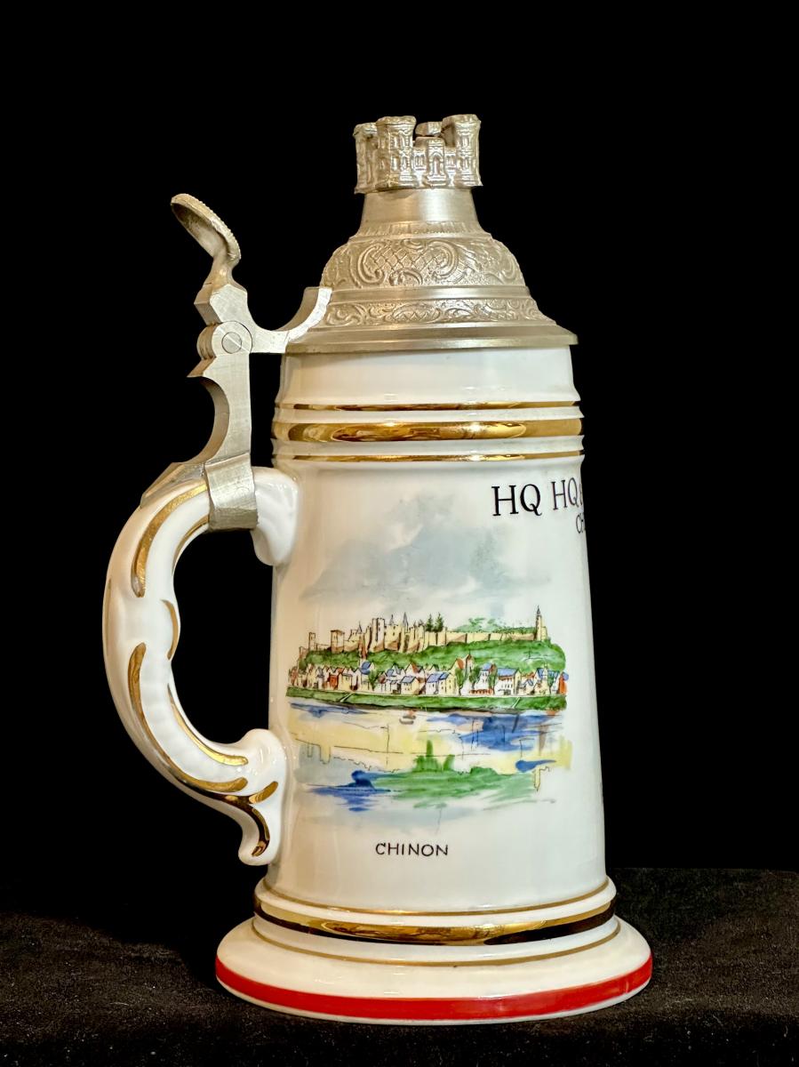 1/2 liter, porcelain, Cold War Stein named to Vern Huffman, HQ HQ & SVC Co 7743 AU, Chinon, France, 1956. The central scene is the unit’s shoulder patch. The right side scene is of Chinon and the left is of the Le Pavillon de L’Horloge. The finial is the Engineer castle. The Chinon Engineer Depot was established in 1951, originally as a sub-depot of the Rhine Engineer Depot, Kaiserslautern, Germany, but by 1953 had been elevated to a Class I installation assigned to Poitiers District.