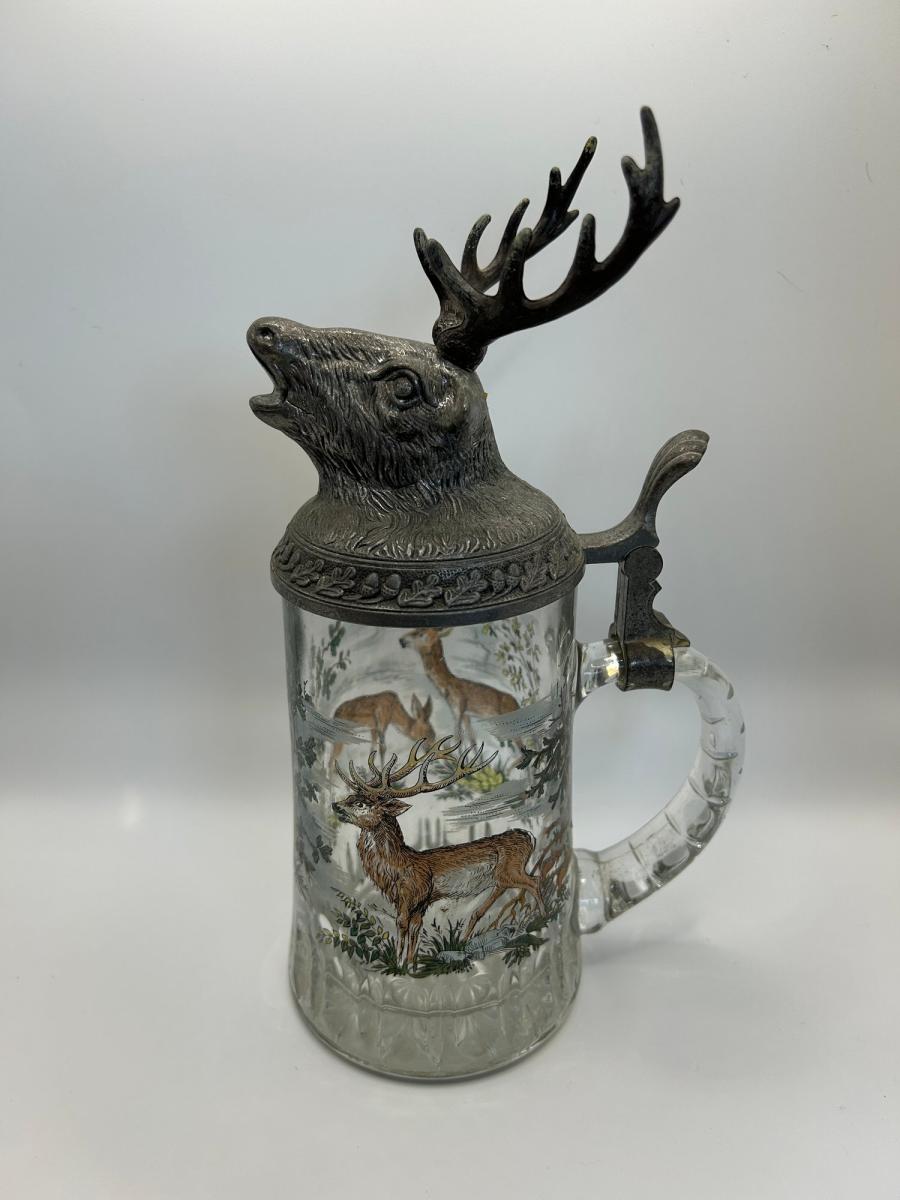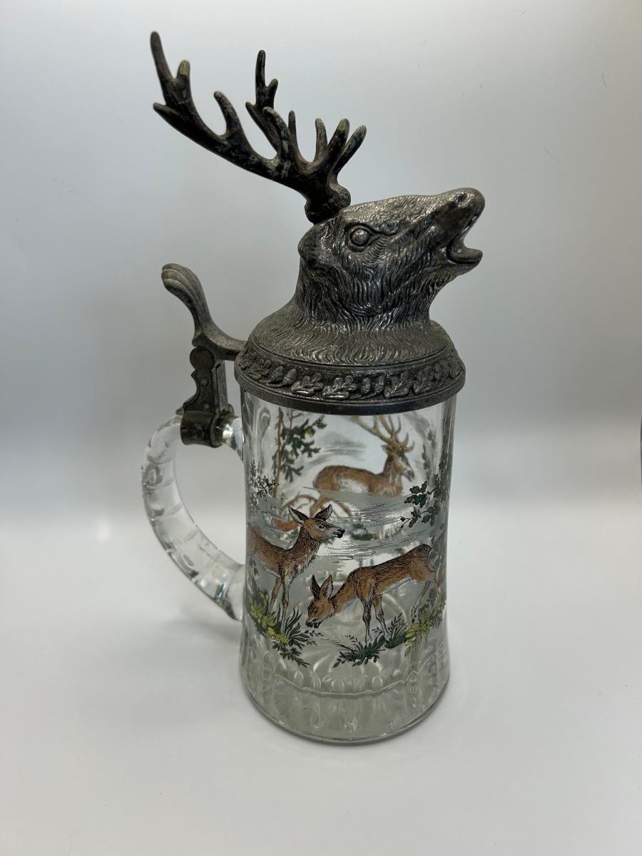 German beer stein with stag's head on lid. Colored scene of a stag and two hinds on reverse.