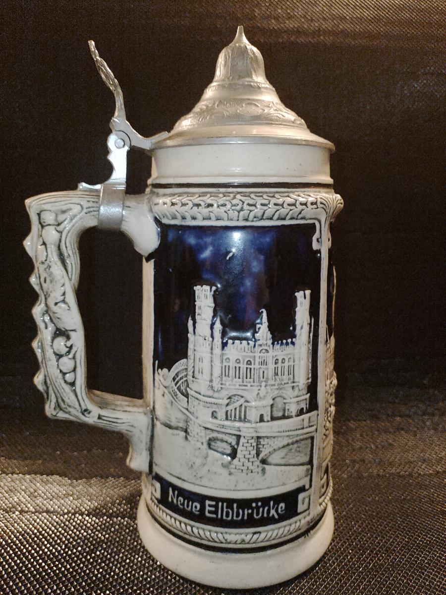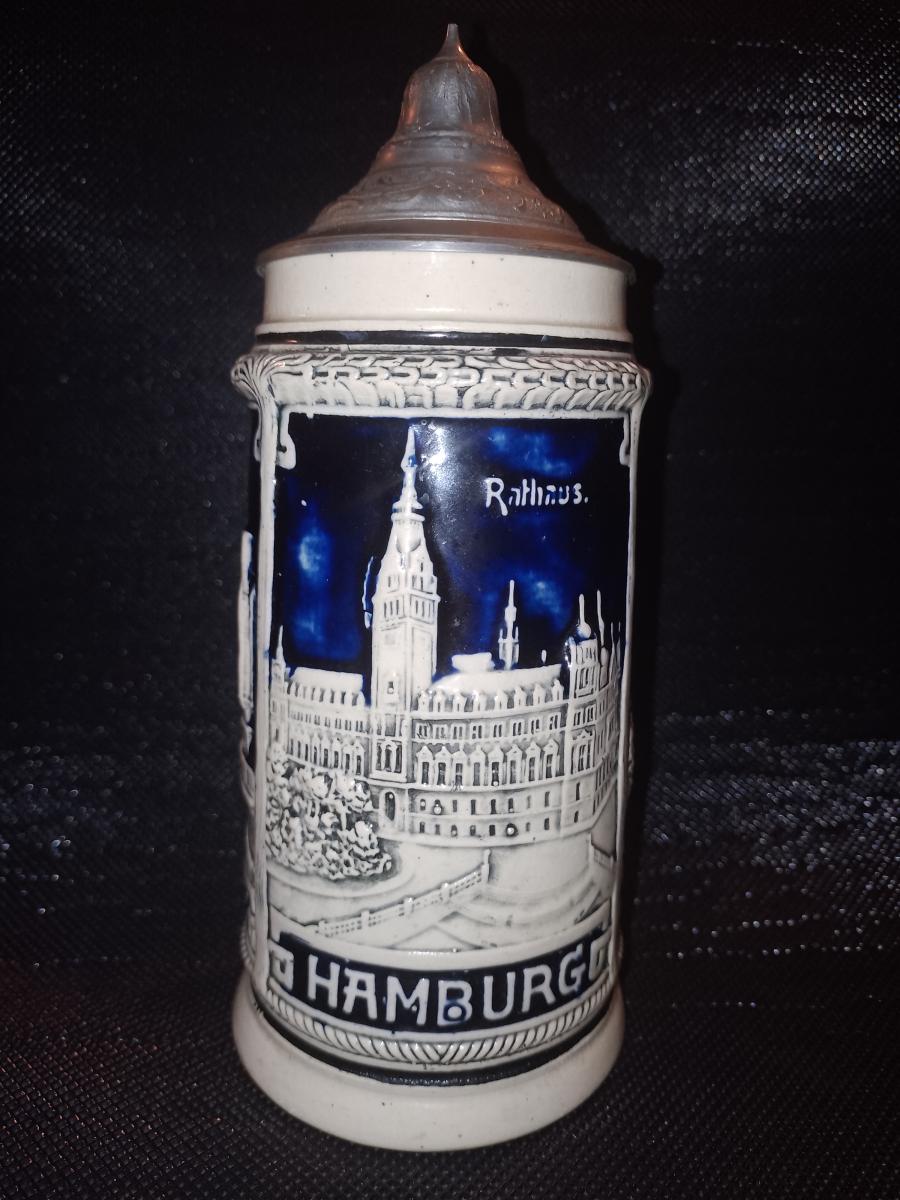 Germany, Hamburg; Relief Souvenir Stein, Elfenbeinsteinzeug Bierkrug, ivory stoneware Beerstein, cream-glazed with dark cobalt-blue background, jugendstil ornaments, three city- views, and cherry-wood design handle.