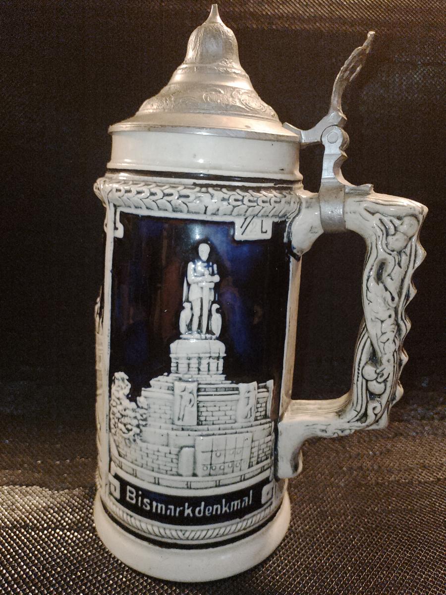 On the right side the Bismarck Monument "Bismarckdenkmal" is shown, which was completed in 1906. According to the "westerwald Beer Stein Handle Gallery" the handle was identified as "JWR#57".Very weak JPT mark on bottom, no mold number.