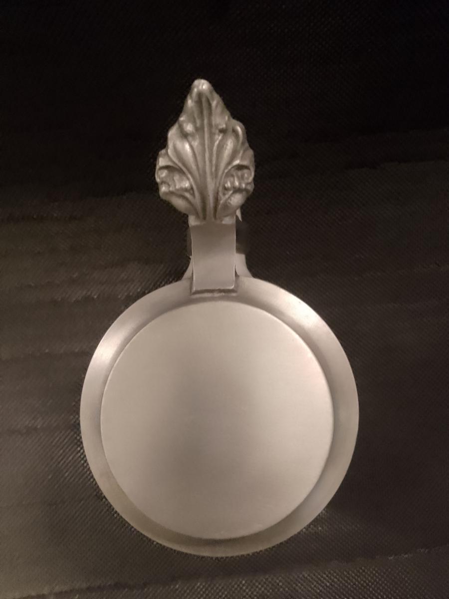 Plain brushed pewter lid with acanthus thumb-lift and five-pin open hinge.
