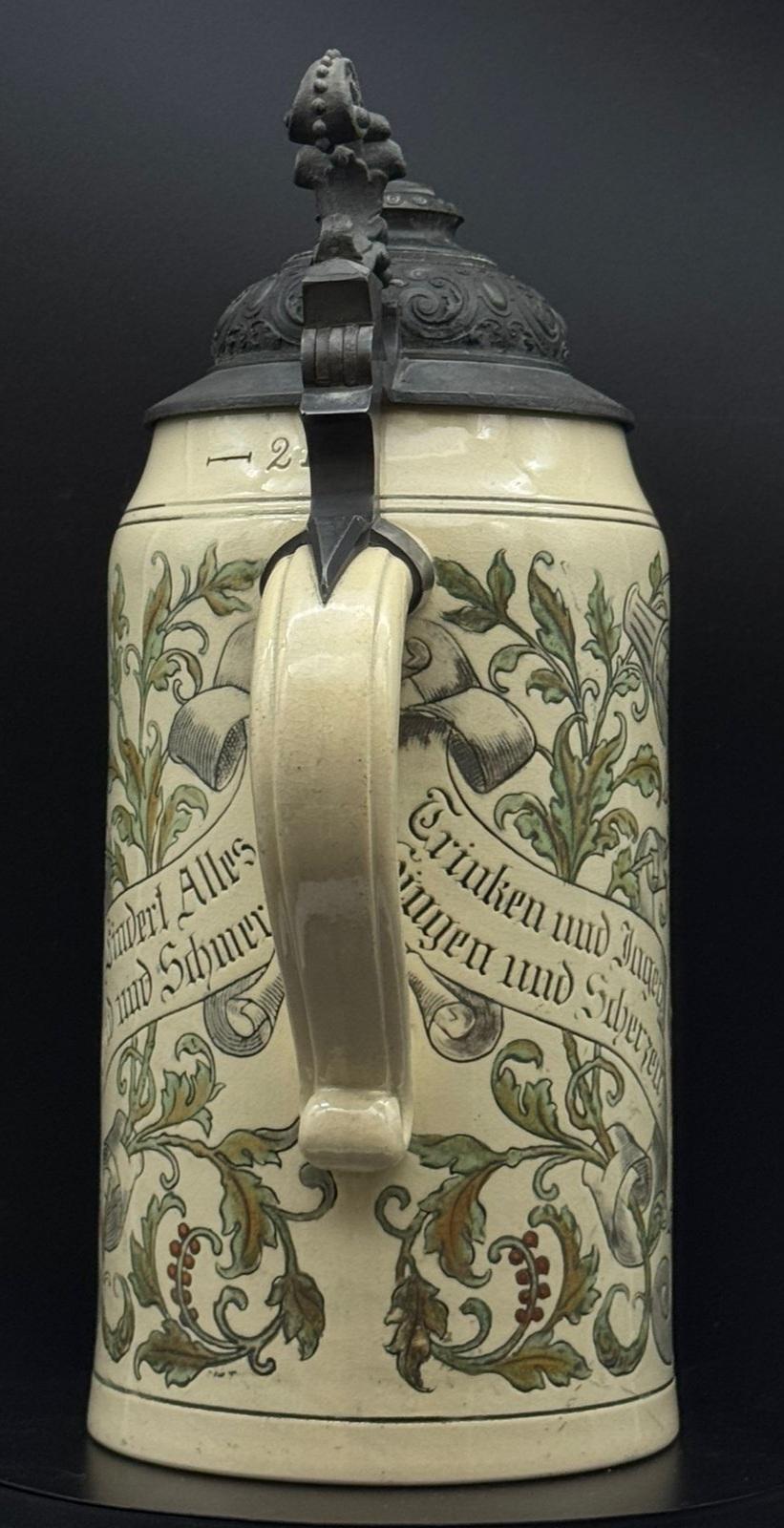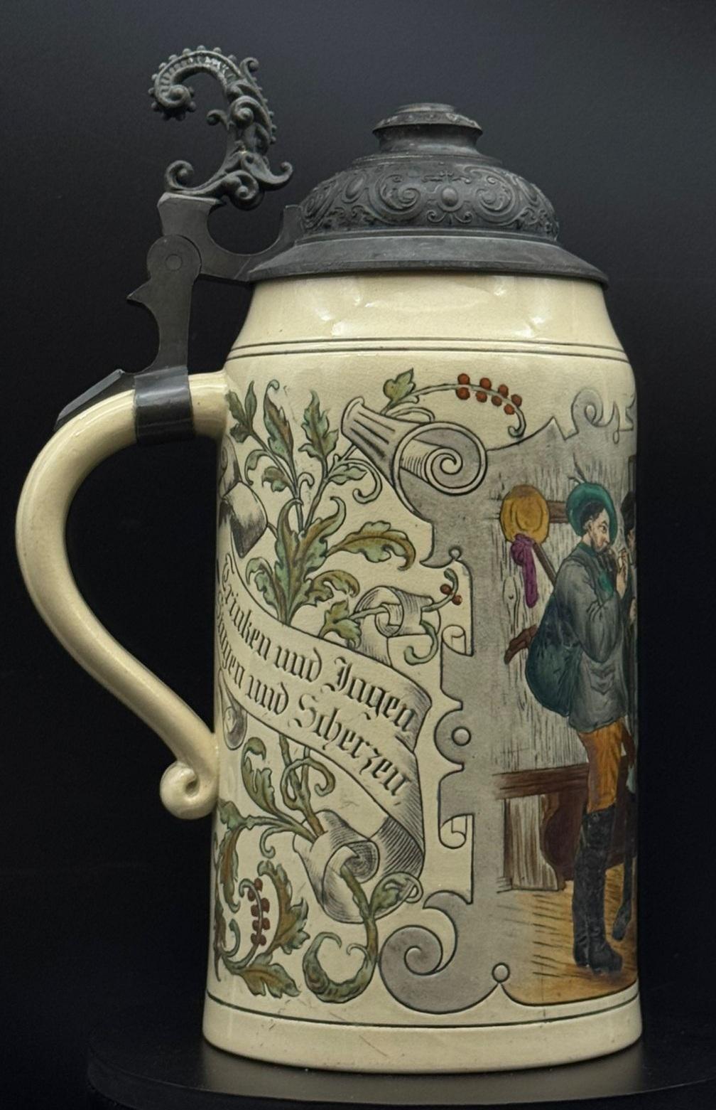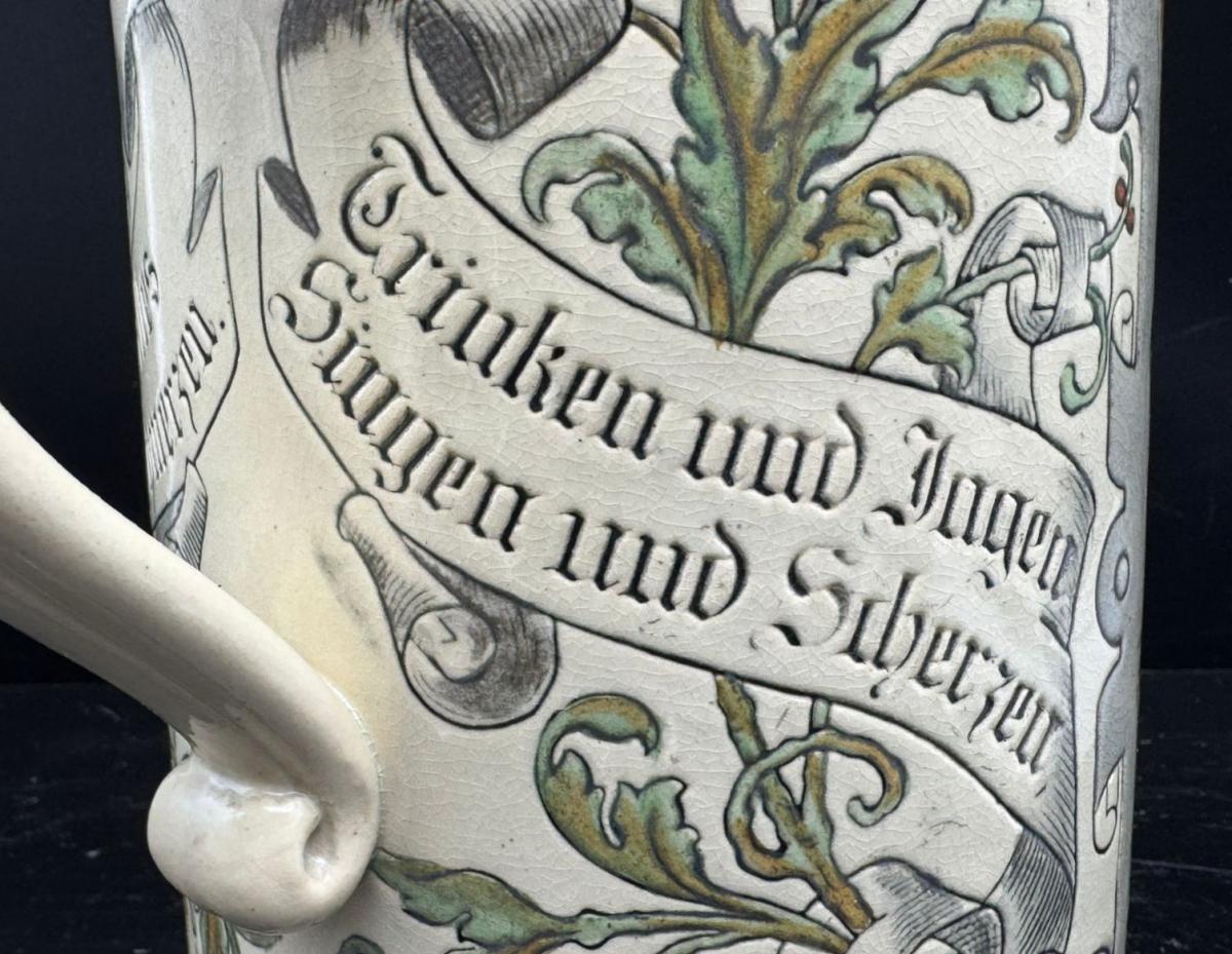 The content of the central part of the drawing is devoted to the theme of hunters' rest in a tavern. To the left and right of the handle, the mug is decorated with floral ornaments with the inscription "Trinken und Jagen, Singen und Scherzen,