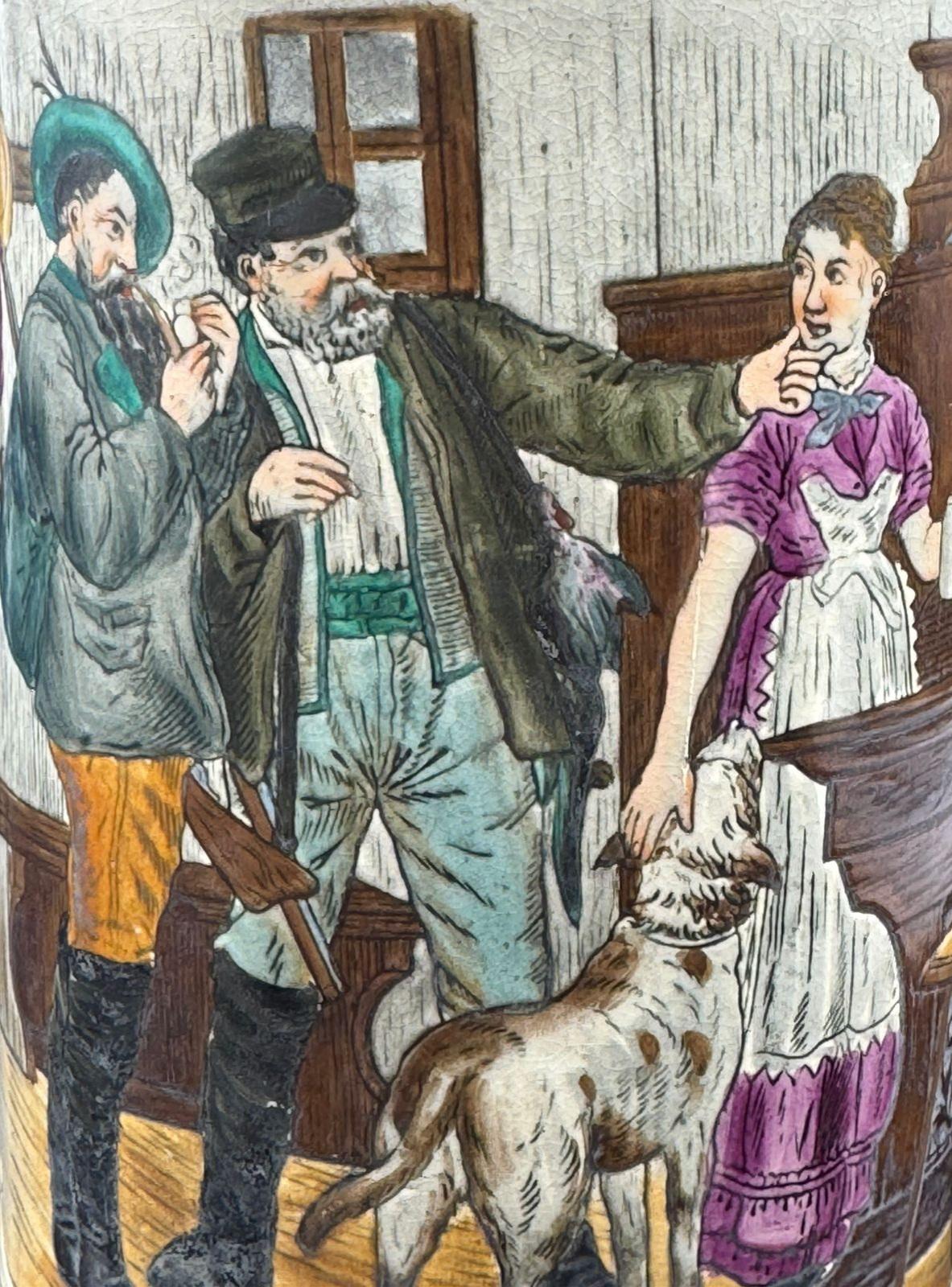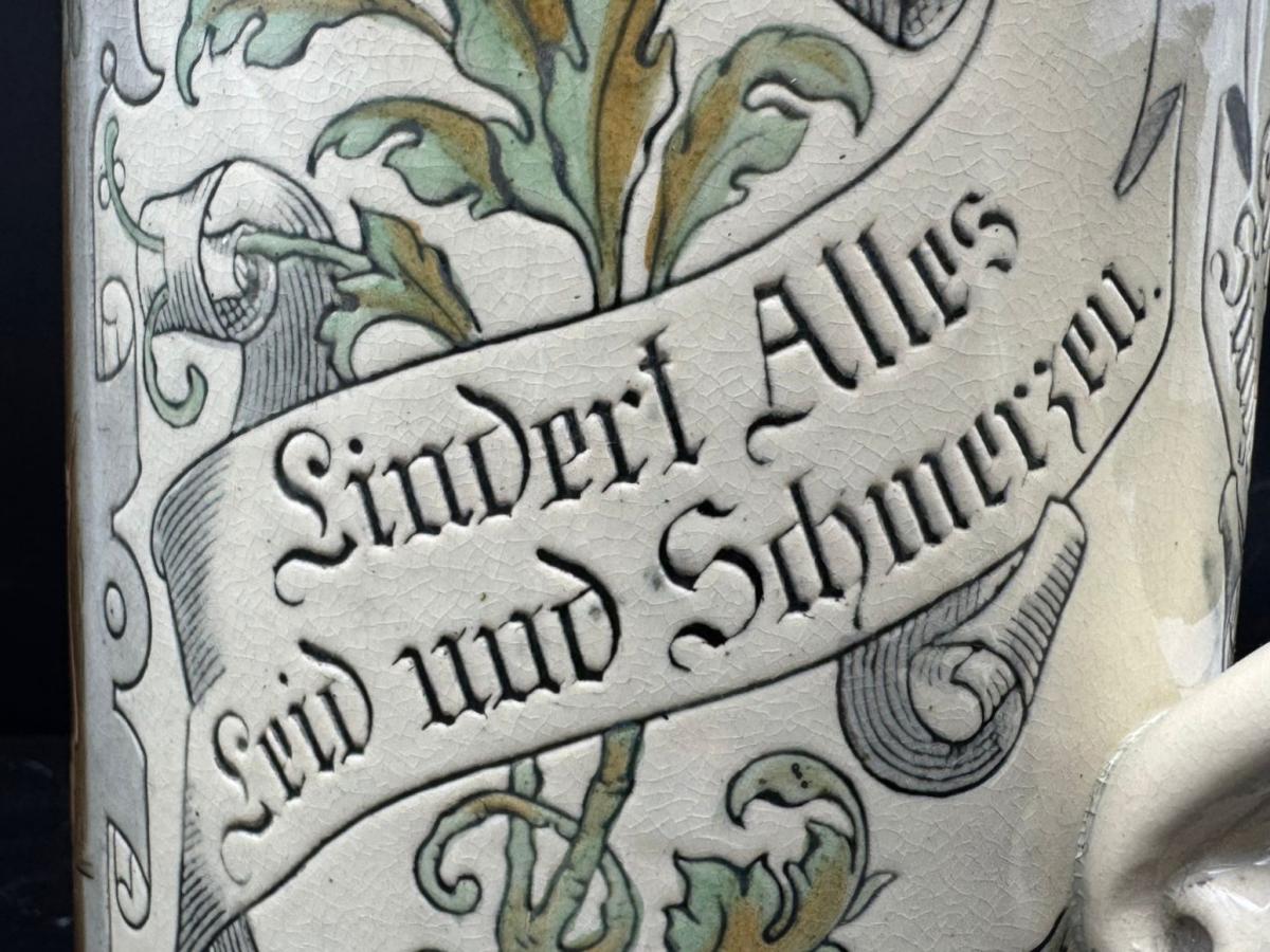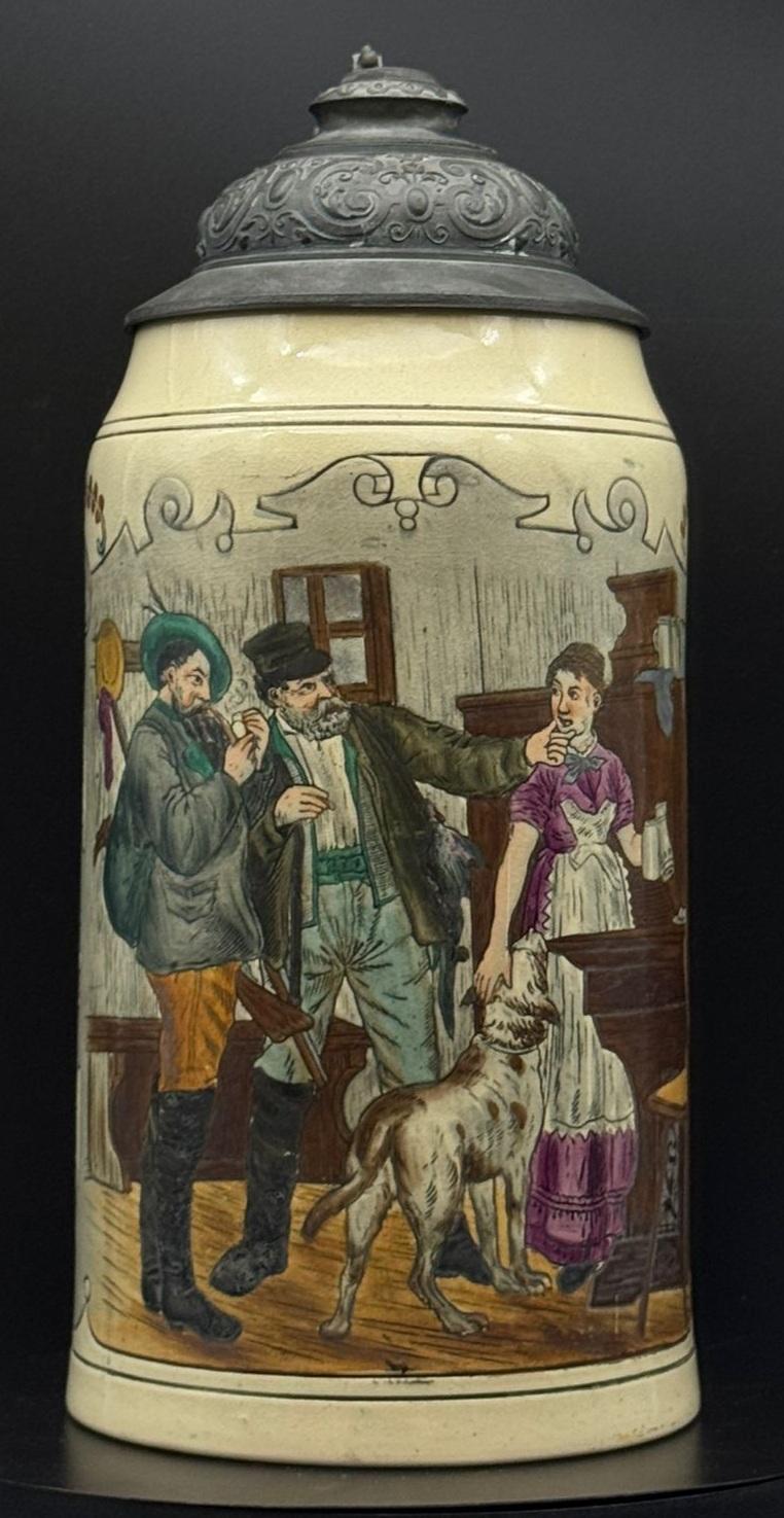 The content of the central part of the drawing is devoted to the theme of hunters' rest in a tavern. To the left and right of the handle, the mug is decorated with floral ornaments with the inscription "Trinken und Jagen, Singen und Scherzen,