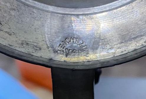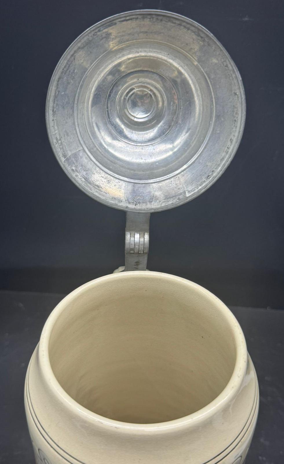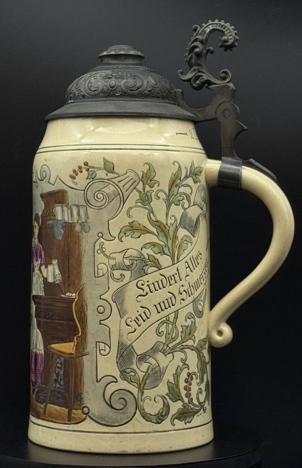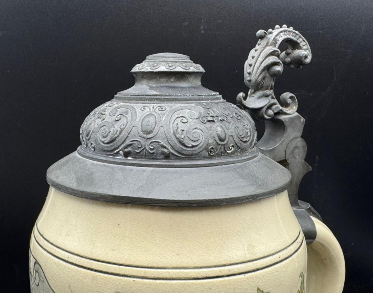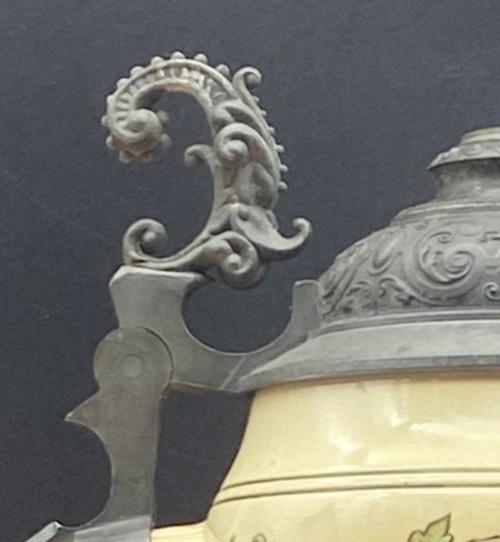 The mug has a massive, ornate lid. The thumb-operated lever of the lifting device is designed as a figurine of a mythical creature. The inside of the lid bears the stamp REICHSZINN M&R. Translated from German, this means "Imperial tin for Marzi & Remy," essentially a standard of state-level quality.