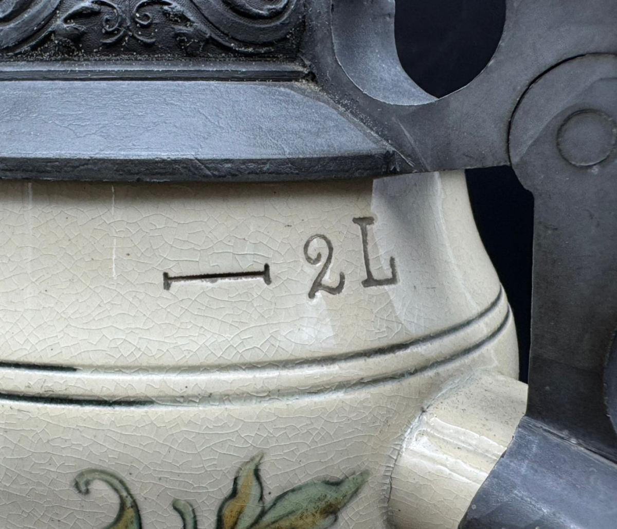 This large beer mug with a capacity of 2 liters was made by the Marzi & Remy manufactory. The mug is made using a complex and expensive etching technique. The size of the mug adds to its uniqueness and value. The design of the mug's surface was created by Gustav Thinwibel, a renowned artist of his time. Gustav Thinwibel was invited by the Marzi & Remy factory to come to Hör in 1879 to design the mug. It follows that the mug could have been made after 1879.