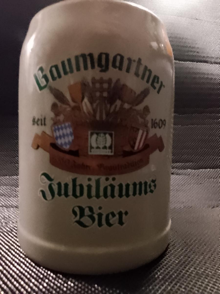 Austria, Upper Austria, Schärding; Brewery Stein, Advertisement for the Jubilee Beer celebrating 380 years of brewing tradition. Cream-glazed stoneware Bierkrug with transfer-print saying: "Baumgartner Jubiläums Bier - Seit 1609 - 380 Jahre Brautradition".