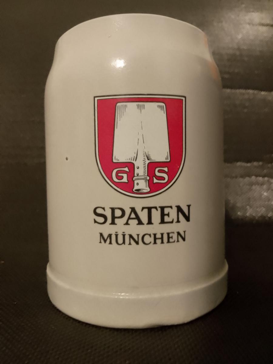 Germany, Bavaria, Munich; Brewery Stein, cream-glazed stoneware with transfer print depicting brewery logo and "Spaten München" in black.0,5l capacity mark and marker's mark FS in diamond for Franz Stöber on side. Bottom stamped "W. Germany".
