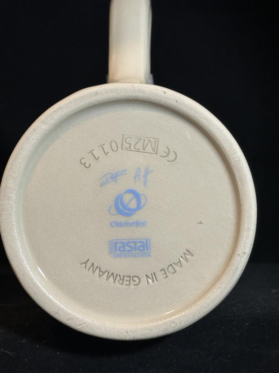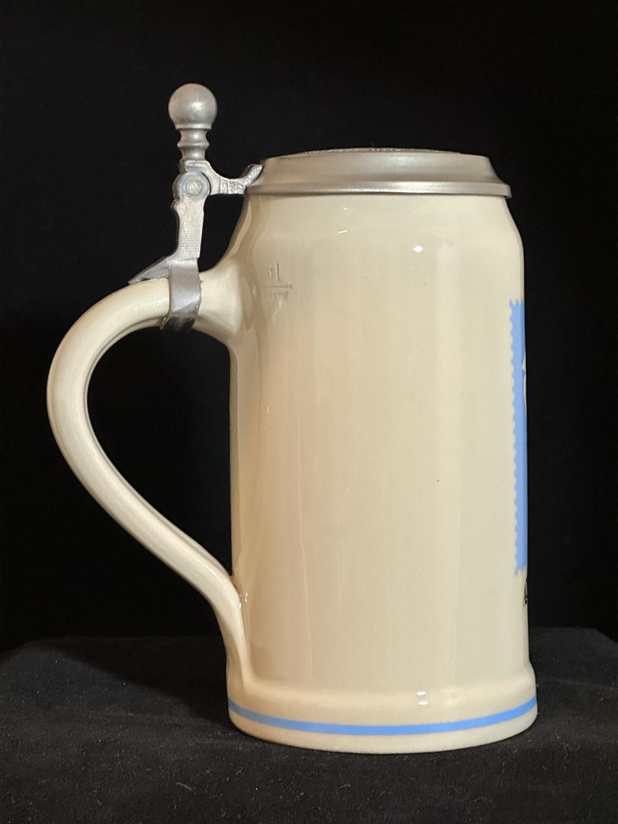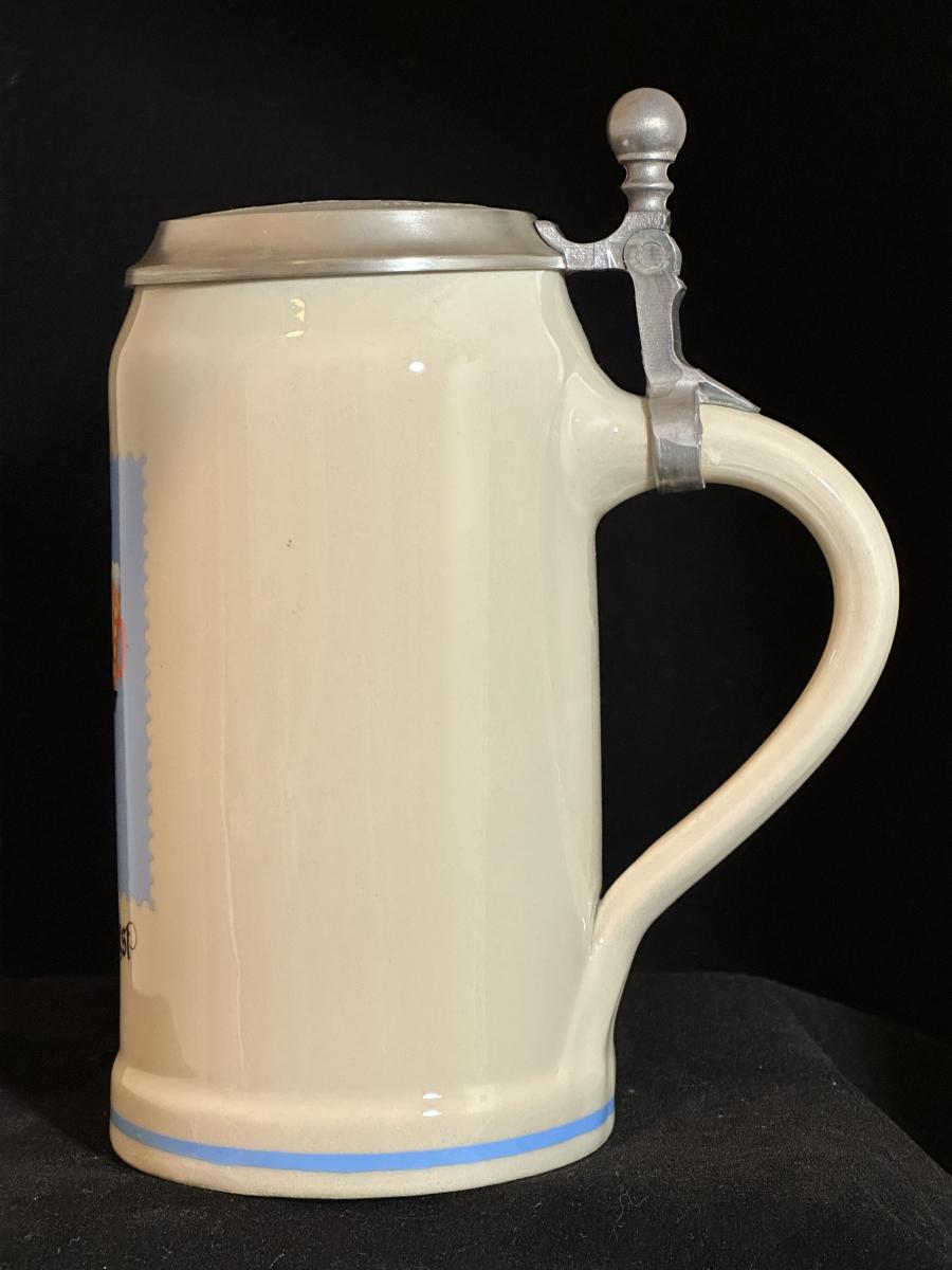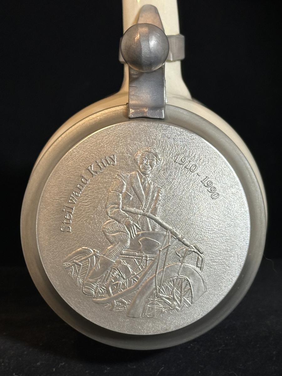 1 liter stoneware stein produced by Rastal with a pewter lid honoring “Steilwand Kitty” (1910-1980) who, starting in the 1930s was one of the first women to participate in the steep face motorcycle riding. Her motorcycle was a 1921 Indian Scout 101. The central scene represents all the workers who make the fest possible, the showmen, waiters and helpers.