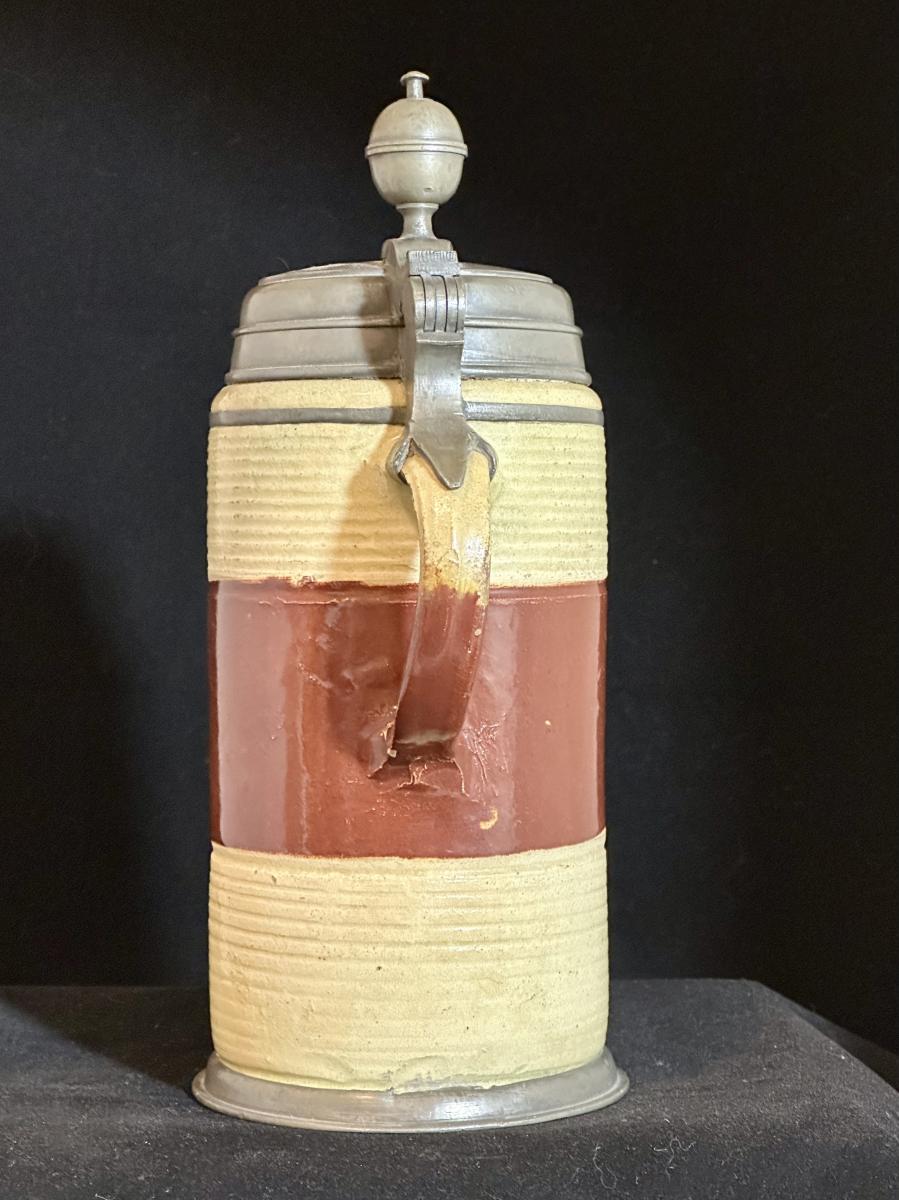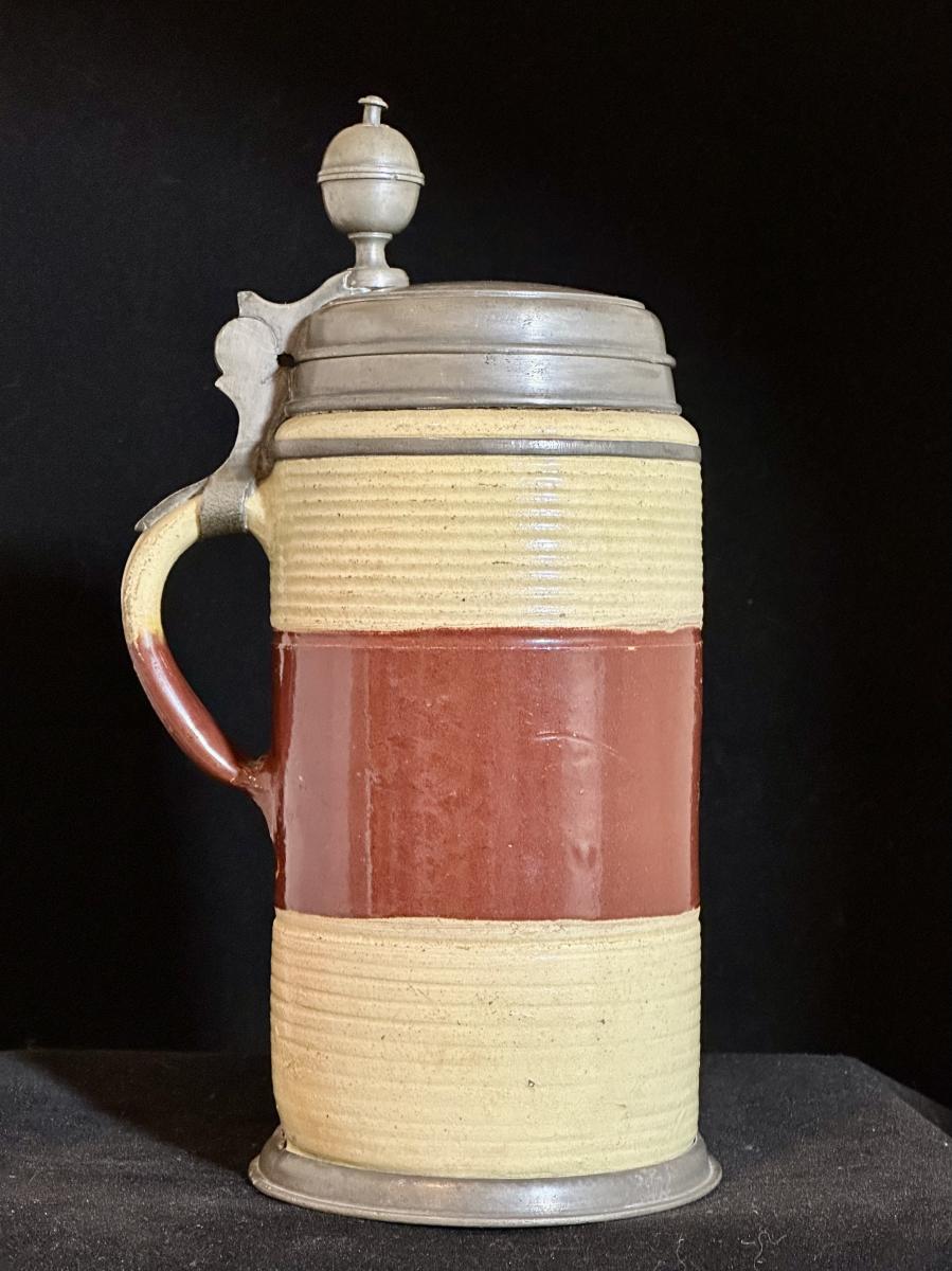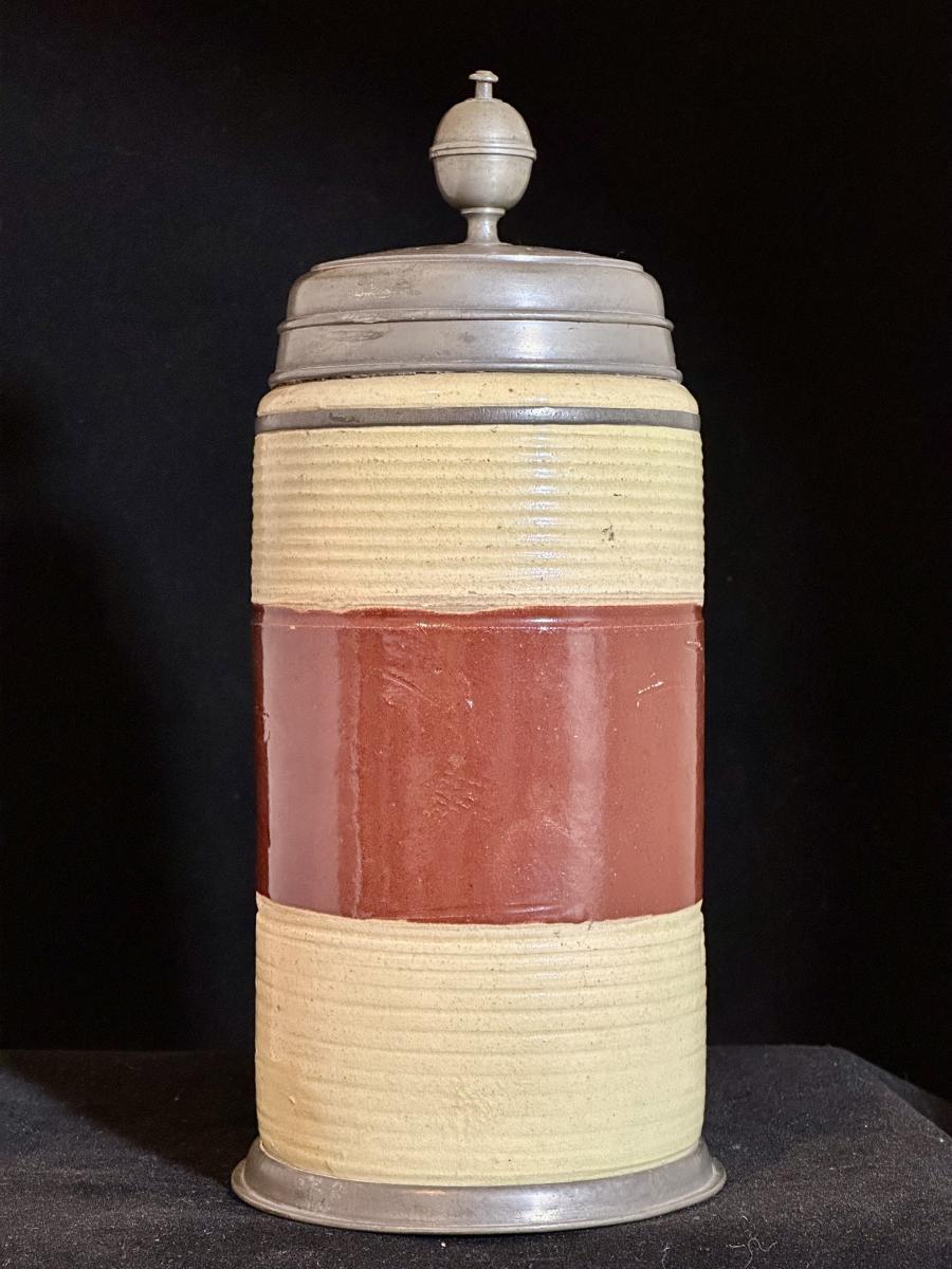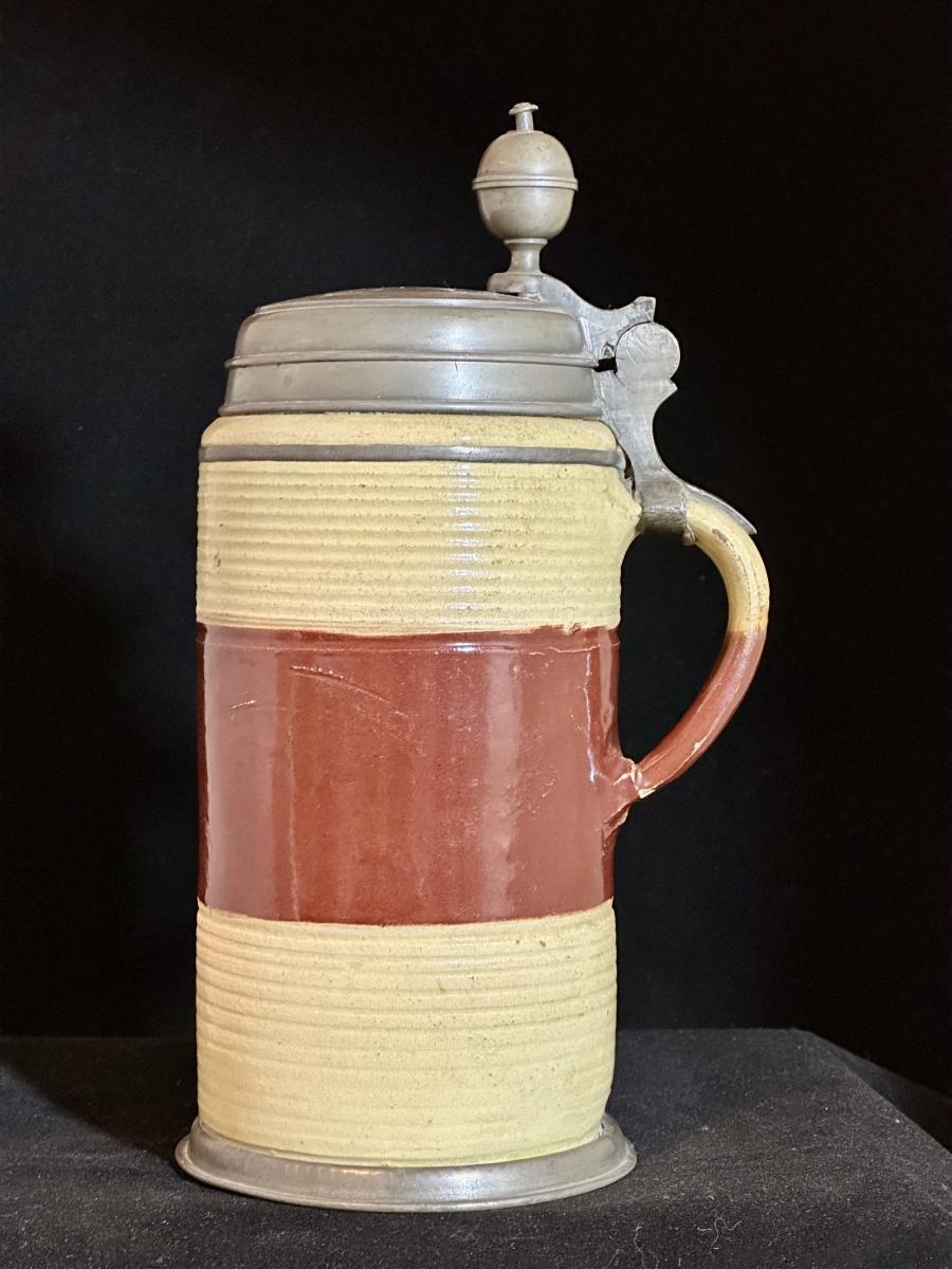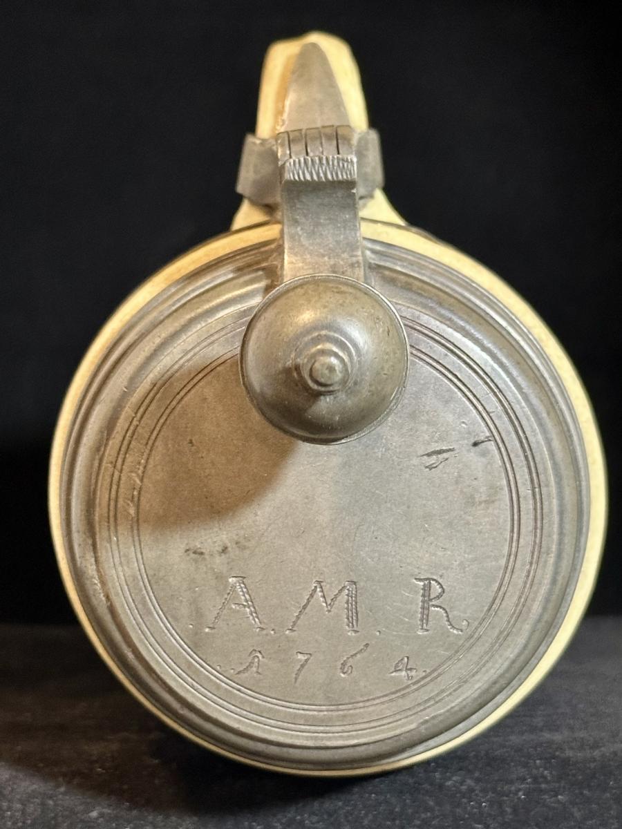 “Rochlitz Honey Stein“ High fired Earthenware stein ca mid-late 18th Century stoneware stein with pewter lid marked with “AMR 1764”