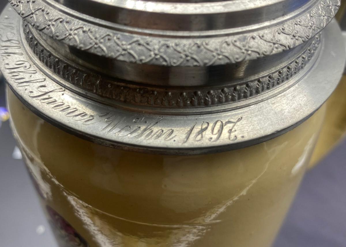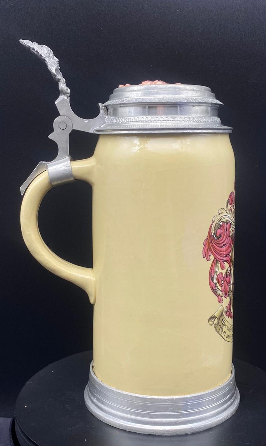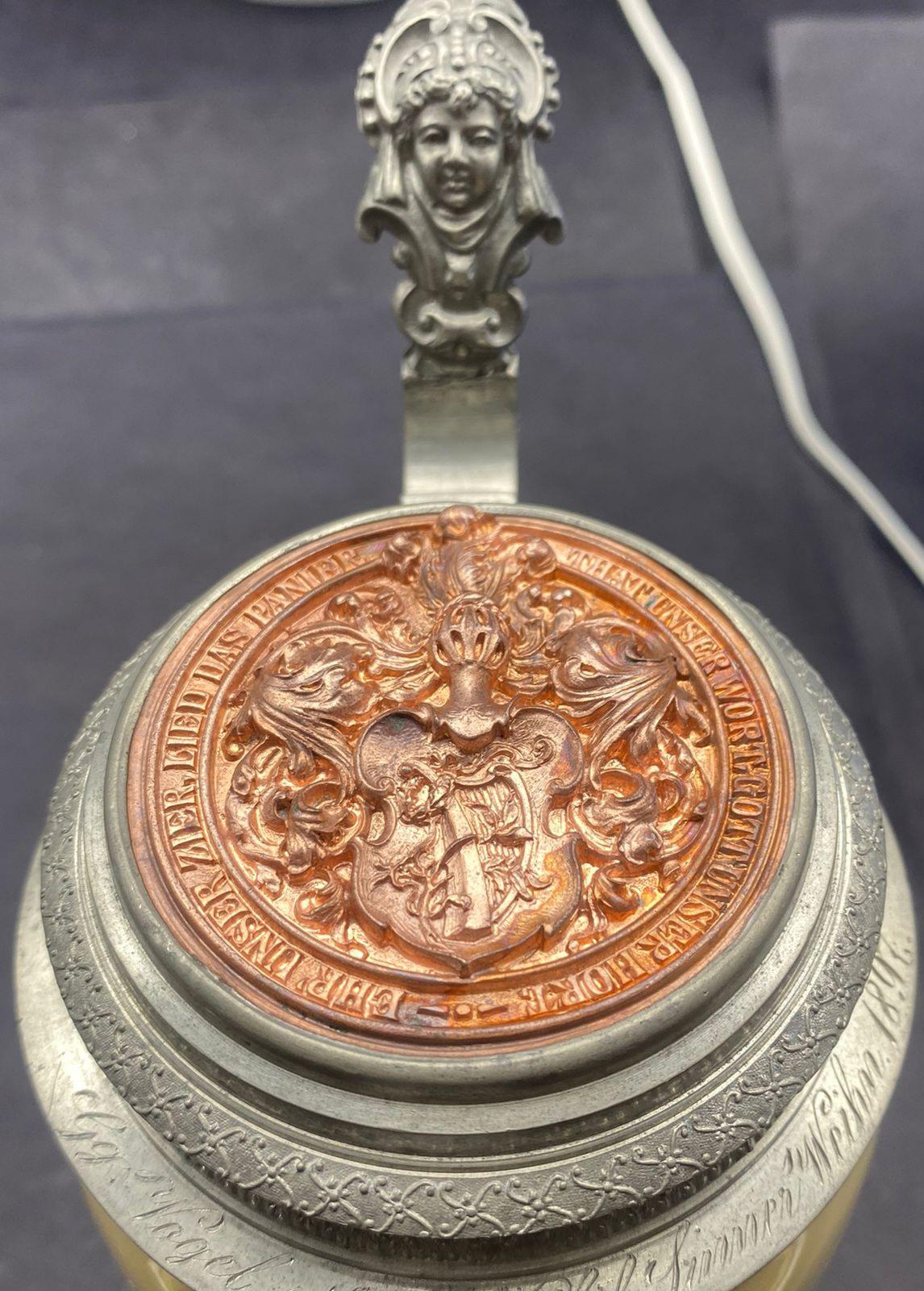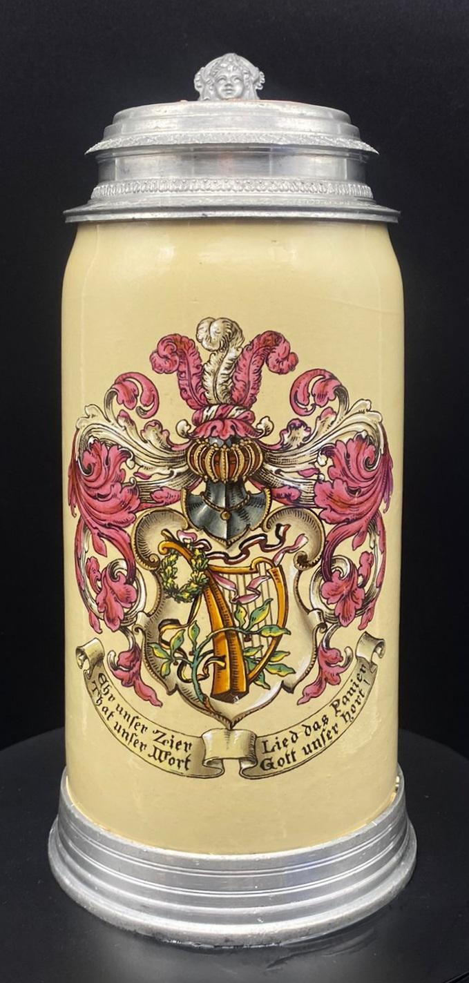 All German student associations had their own coat of arms and motto. The AGM coat of arms is depicted on the mug. In its lower part there is an inscription in German: "Ehr unser Zier, Lied das Panier, That unser Worth,
