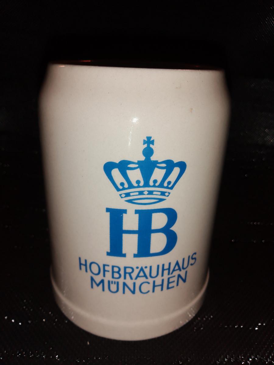 Germany, Bavaria, Munich; Modern Brewery Stein cream-glazed stoneware with cobalt-blue transfer print depicting brewery logo and crown and "Hofbräuhaus München", 0,5l capacity mark on side beneath GERZ marker's mark.