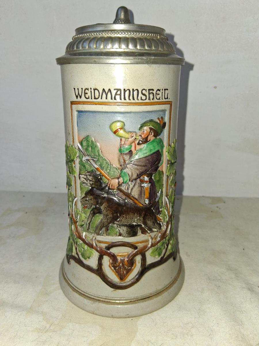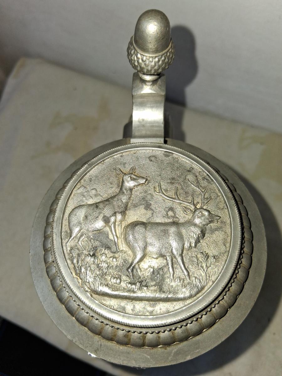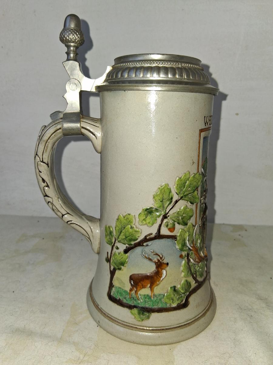 One of those steins that look better in person. The one liter version of this is mold 874. Acorn thumblift, the acorn was a symbol of good luck. Recessed base.