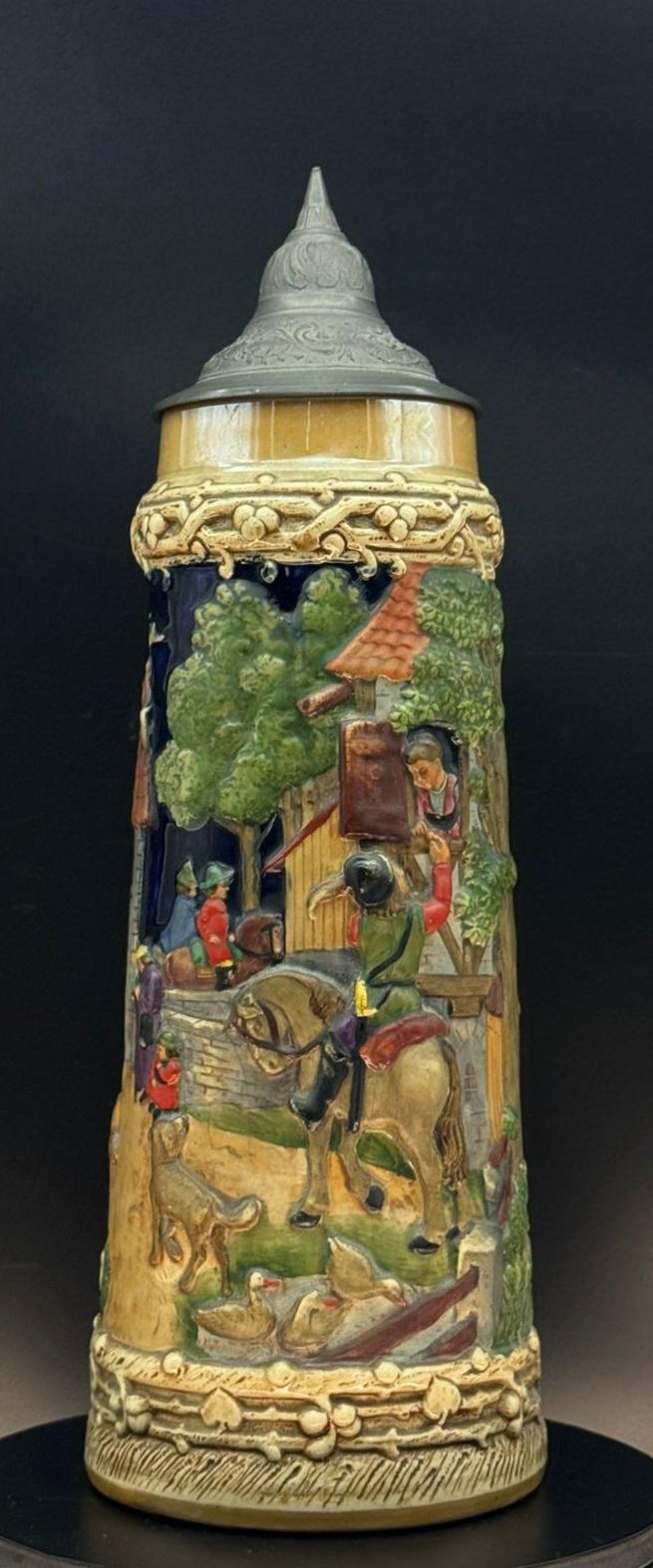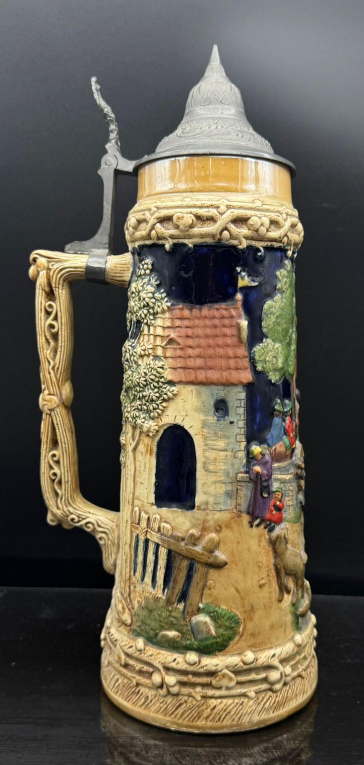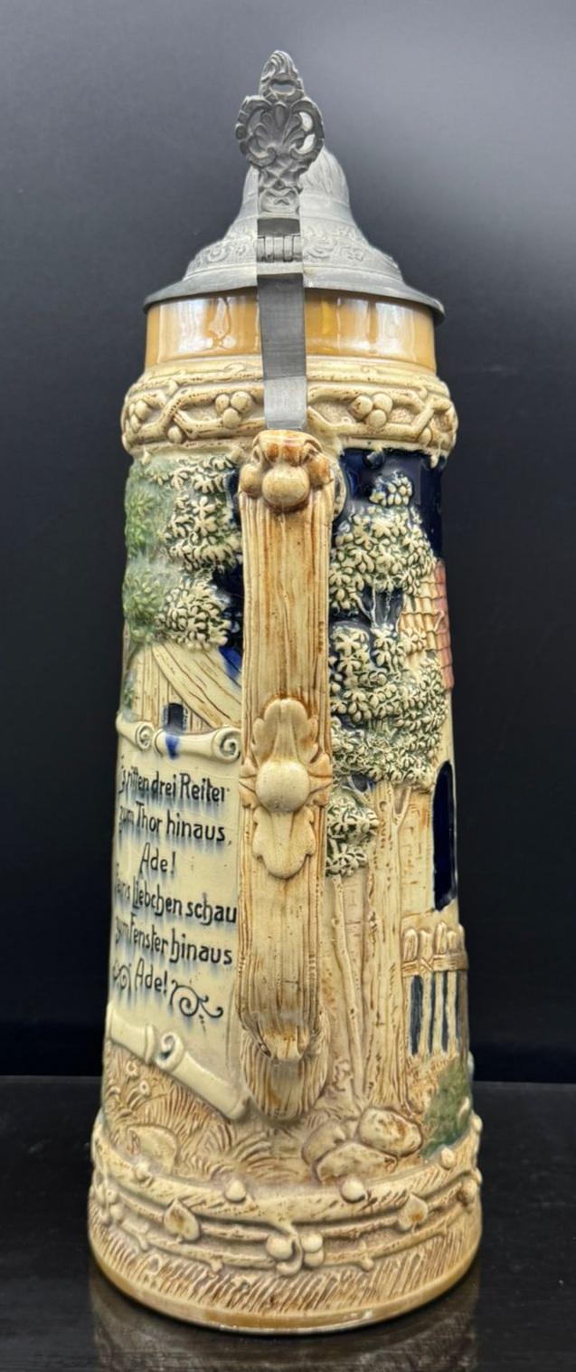 This large 2-liter mug was made at the S.P. Gerz factory between 1895 and 1905. The mug is decorated with artistic reliefs. The design of the mug's mold was created by the artist Rudy Dekker. His graphic signature, a monogram of the letters R and D, is engraved on the mug. This makes the mug more unique.
