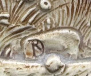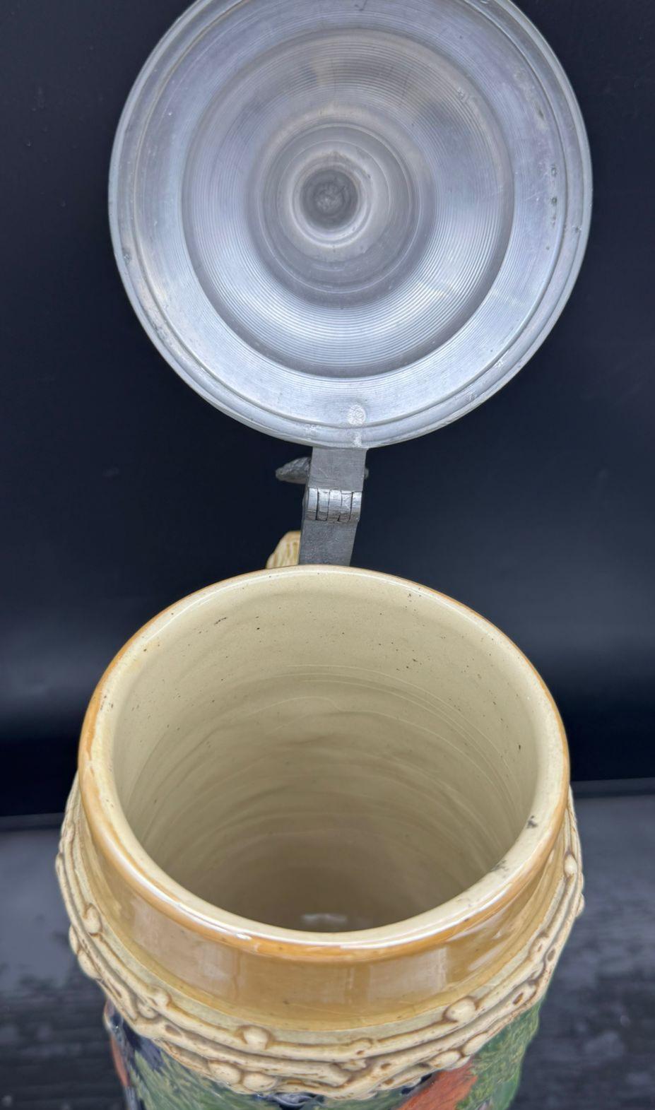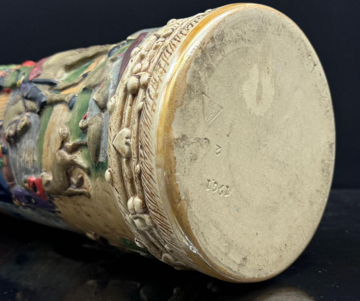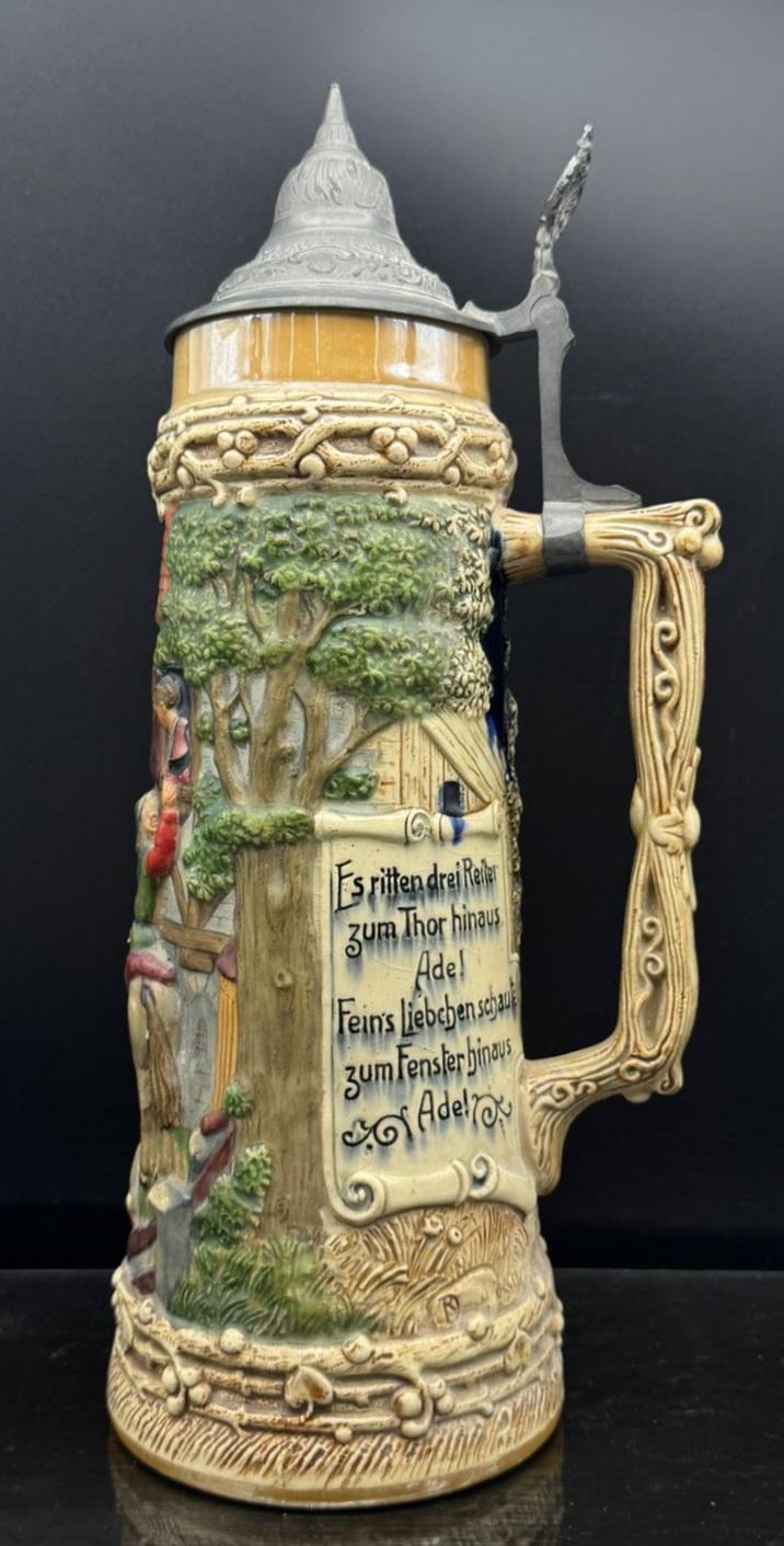 This large 2-liter mug was made at the S.P. Gerz factory between 1895 and 1905. The mug is decorated with artistic reliefs. The design of the mug's mold was created by the artist Rudy Dekker. His graphic signature, a monogram of the letters R and D, is engraved on the mug. This makes the mug more unique.