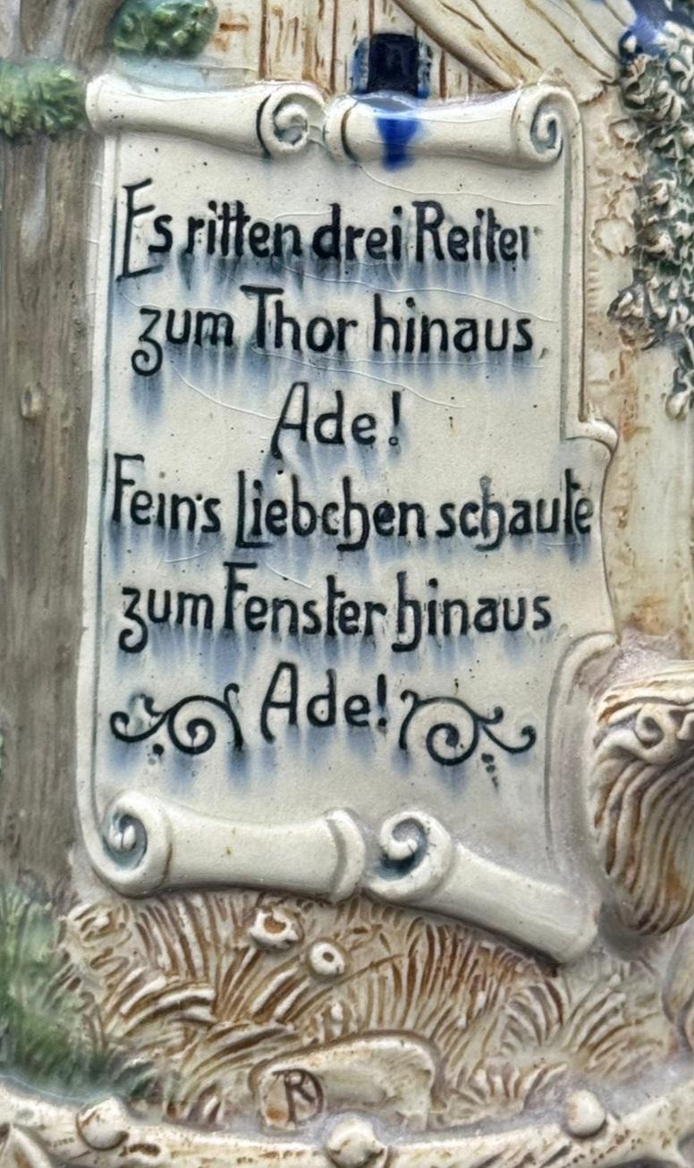 On the left side of the mug, there is a scroll with an inscription in old German. Translated from German, the inscription reads as follows: