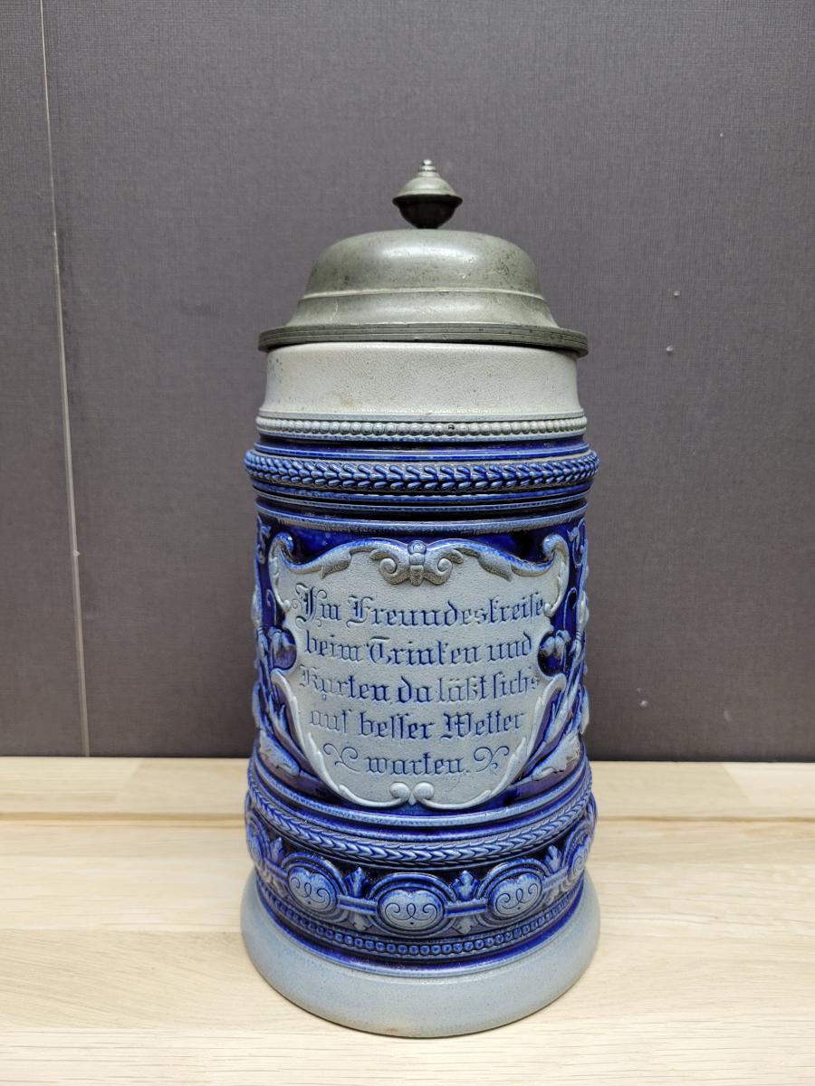 Phrase on the front: "Im Freundeskreise beim Trinken und Karten, da läßt sich's auf besser Wetter warten.", which translates as 'In a circle of friends with drinking and cards, there let yourself wait for better weather.'