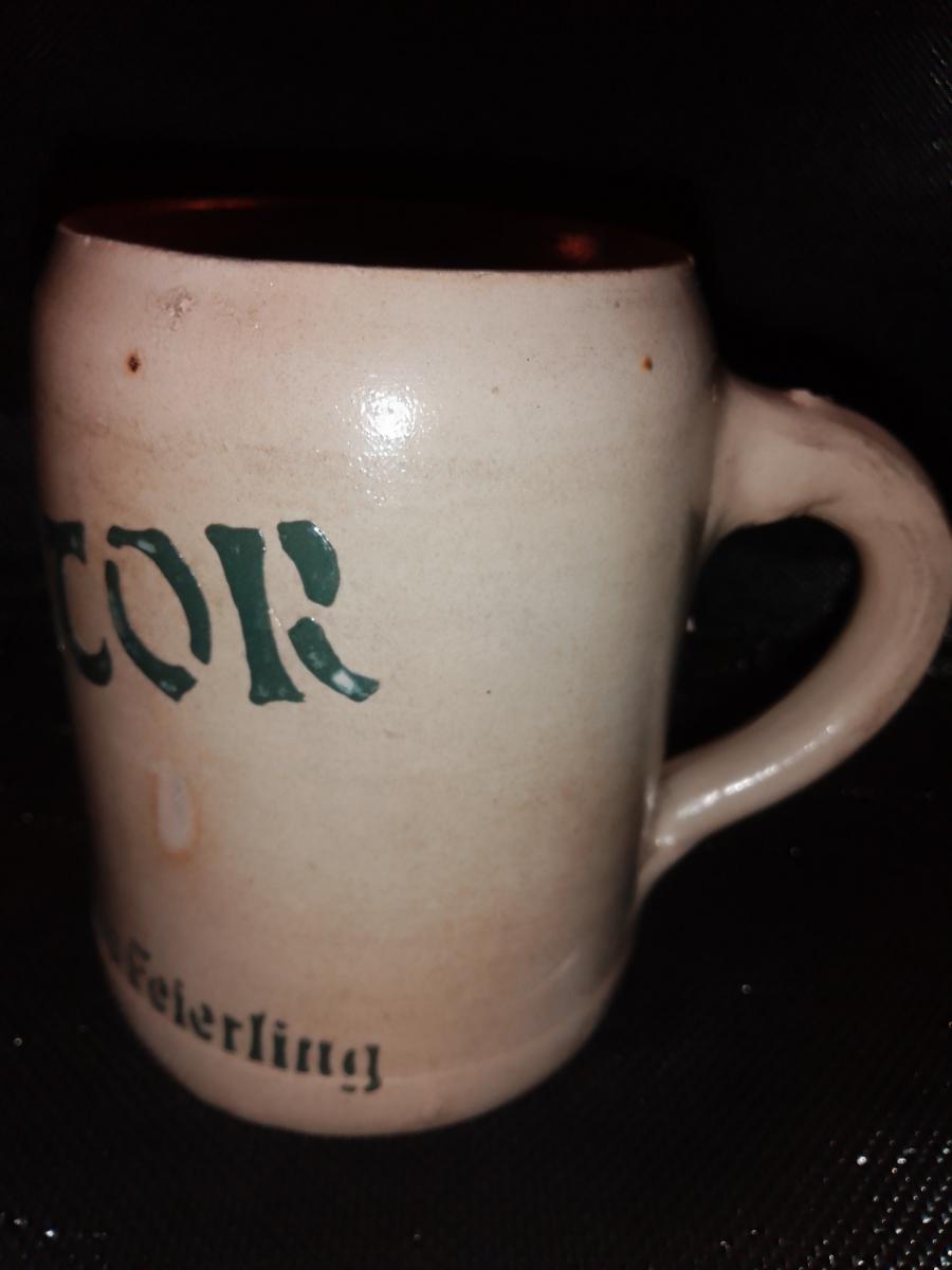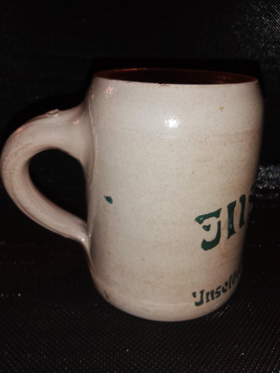 Germany, Baden-Württemberg, Freiburg im Breisgau; very old Brewery Stein cream-glazed stoneware with stencil print "INSULATOR - Inselbrauerei Julius Feierling" in dark- green enamel paint. 1/2 L capacity mark in front, handle with hole for better lid attachment, no Marker's Mark.