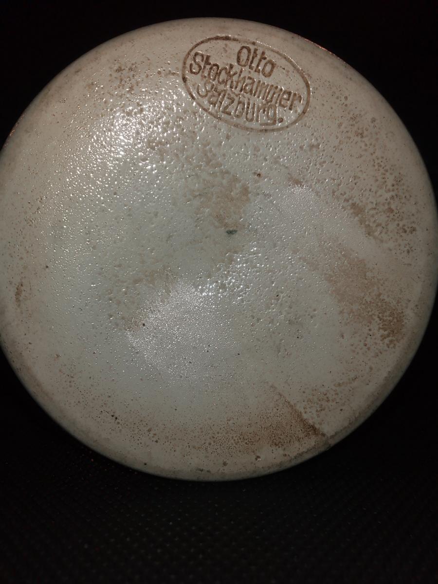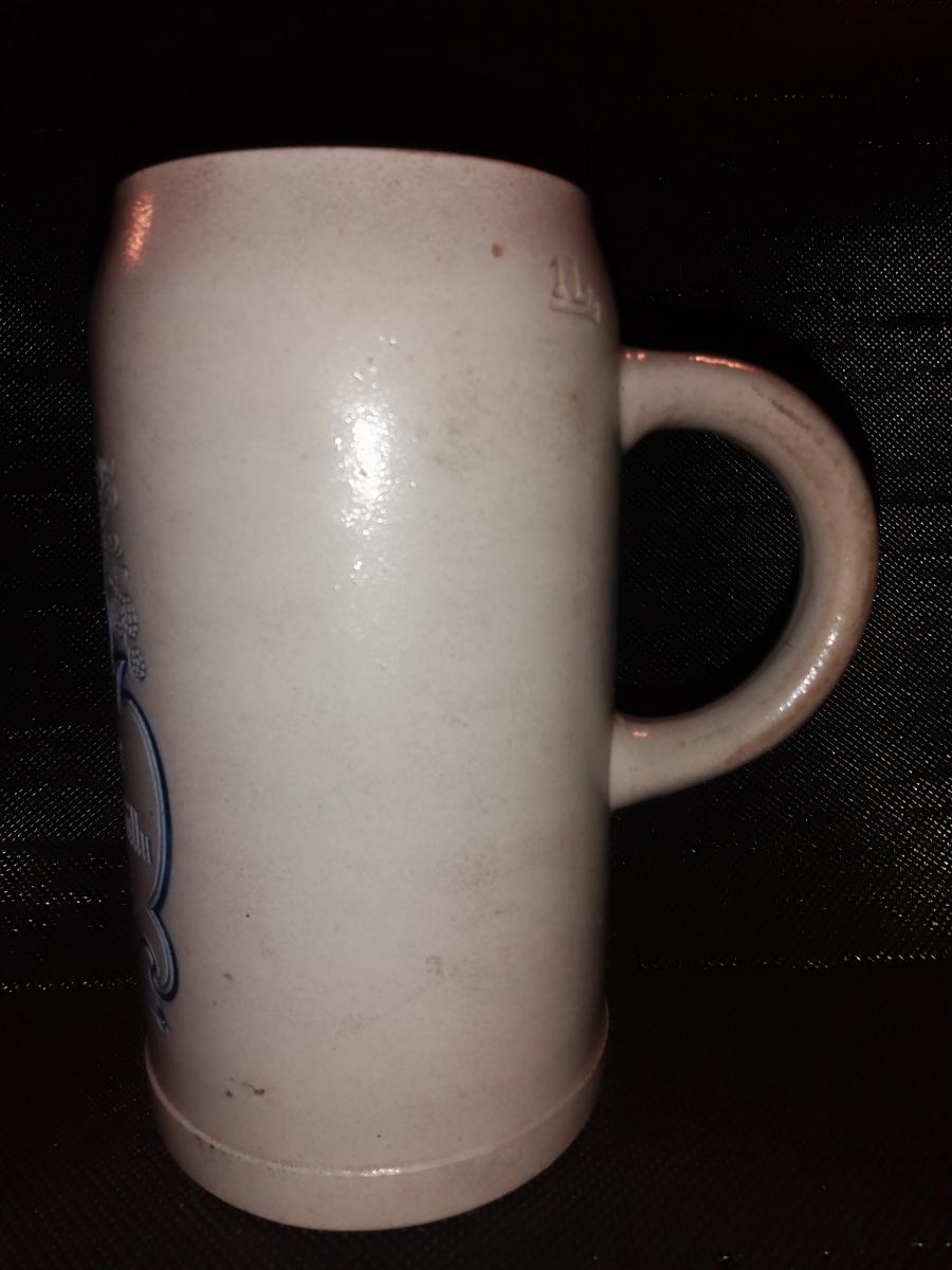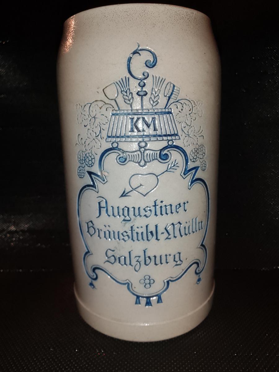 Austria, Salzburg, Mülln; Brewery Stein salt-glazed stoneware with metal-sheet incised contures and cobalt-blue paint saying "Augustiner Bräustübl Mülln Salzburg". 1L capacity mark on side, handle with hole for better lid attachment, bottom stamped "Otto Stockhammer Salzburg".