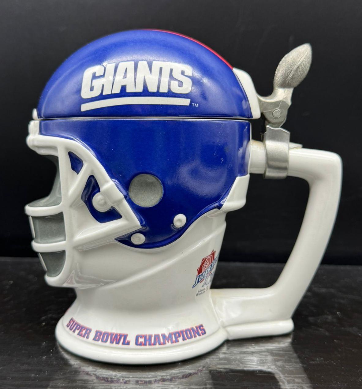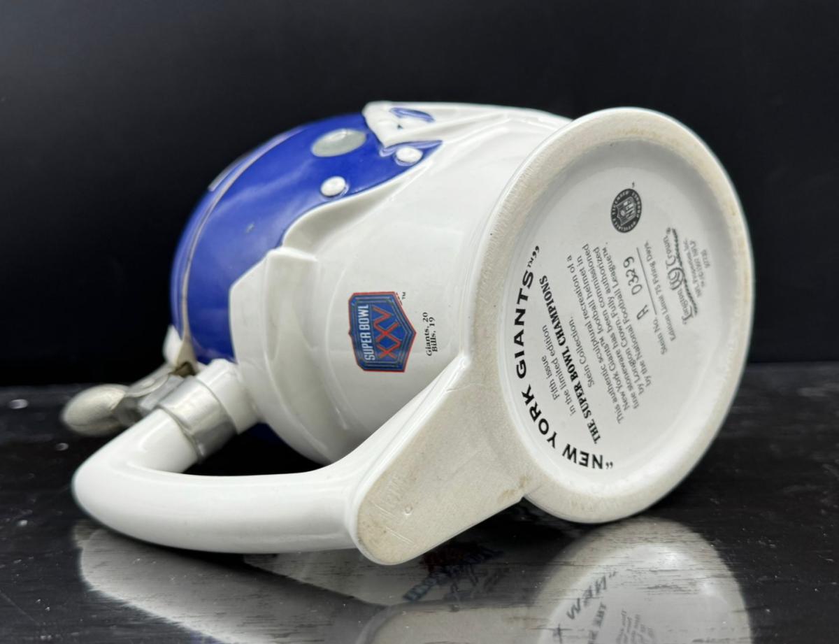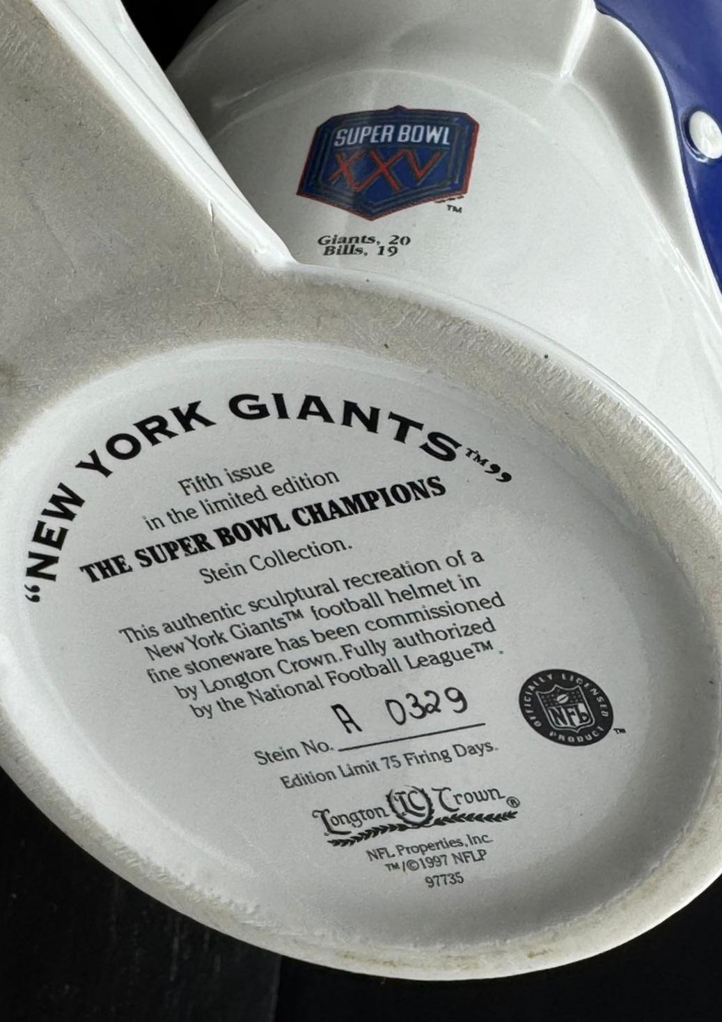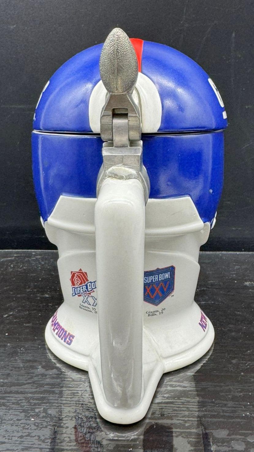 NEW YORK GIANTS Football helmet lidded stein. Super Bowl wins featured around the bottom rear of the stein are: Super Bowl XXI Giants 39 - Broncos 20 and Super Bowl XXV Giants 20 - Bills 19.