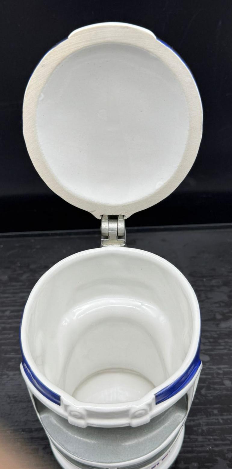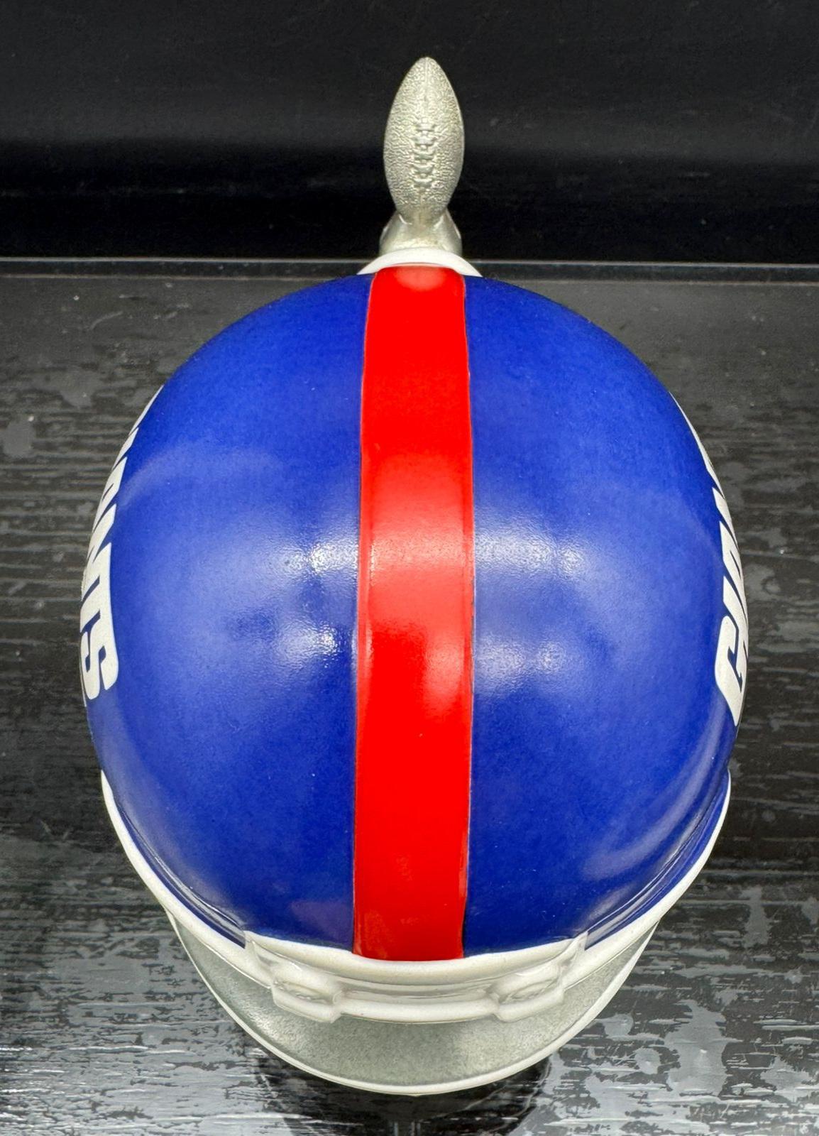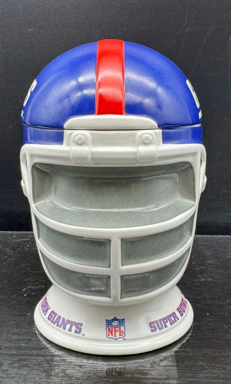 NEW YORK GIANTS Football helmet lidded stein. Super Bowl wins featured around the bottom rear of the stein are: Super Bowl XXI Giants 39 - Broncos 20 and Super Bowl XXV Giants 20 - Bills 19.