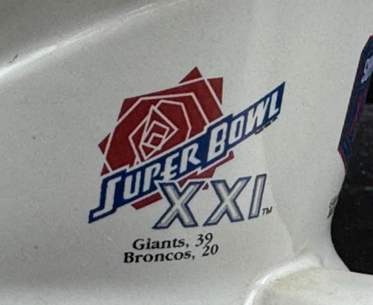 This beer mug is part of the "NFL USA Super Bowl Champions Helmets" collector's series. The mugs in this series were produced by Ceramarte in Brazil between 1996 and 1997. The three-dimensional design replicates the helmets used by the NFL USA. Each mug in the series features the team logos and the number of victories for each team, as well as the Super Bowl logos and the dates of each victory. Each mug is numbered and comes with an authenticity certificate.