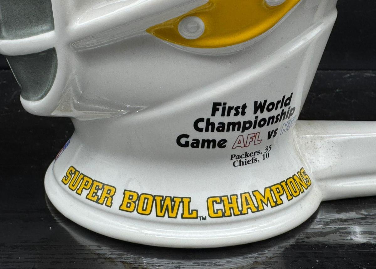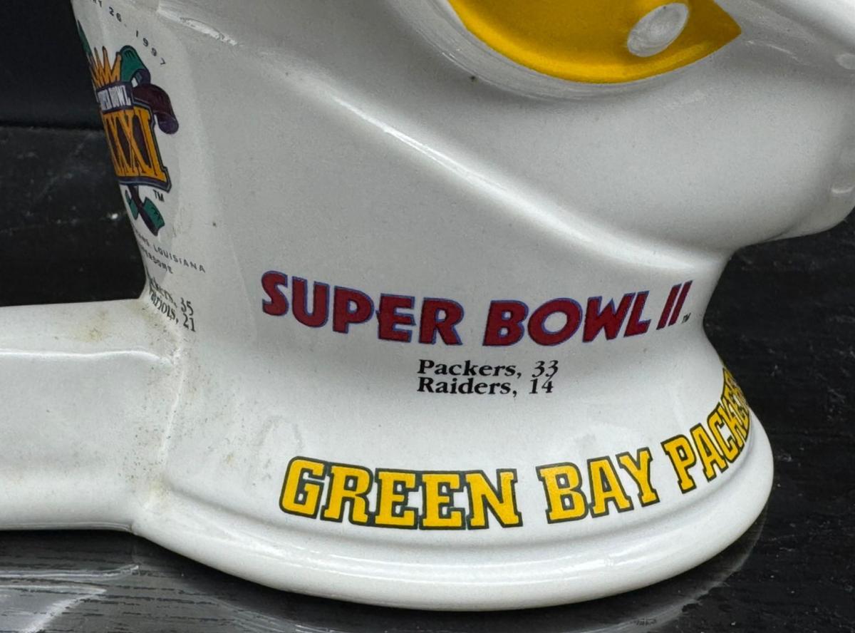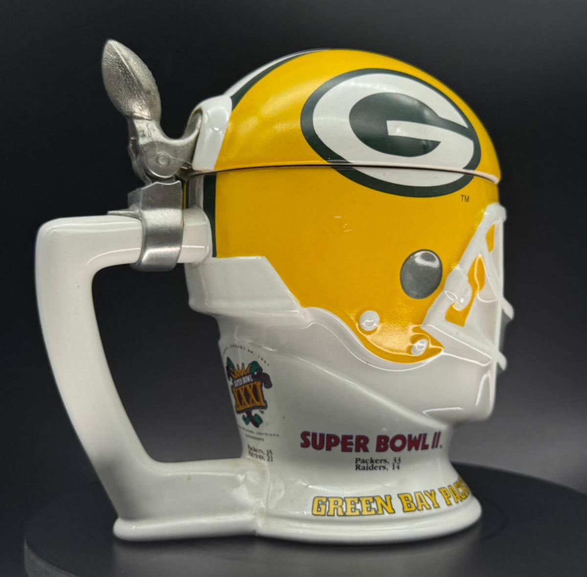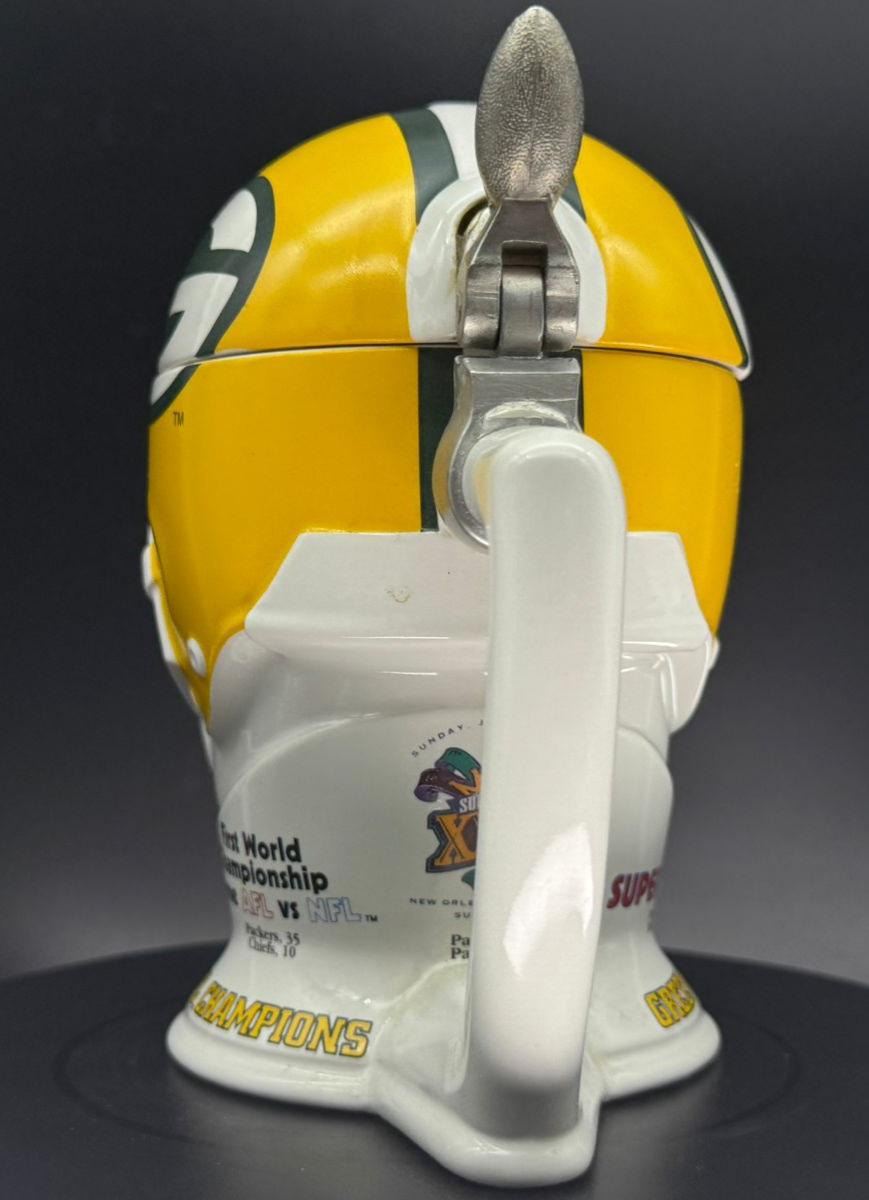 GREEN BAY PACKERS Football helmet lidded stein. Super Bowl wins featured around the bottom rear of the stein are: First World Championship Game AFL vs NFL Packers 35 - Chiefs 10, Super Bowl II Packers 33 - Raiders 14 and Super Bowl XXXI Packers 35 - Patriots 21.
